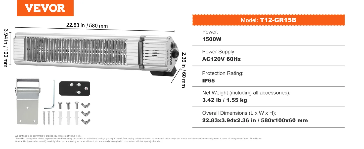 VEVOR Infrared Heater, 1500W Remote Control Electric Space Infrared Heater, IP65 Protection Carbon Infrared Outdoor Heater with 3 Speeds, for Porch,Patio,Dining Room,Studio,Backyard,Garage, Wall Mount