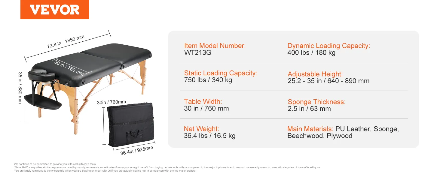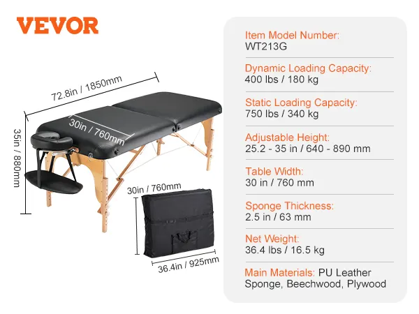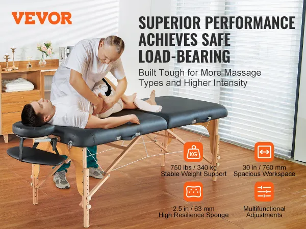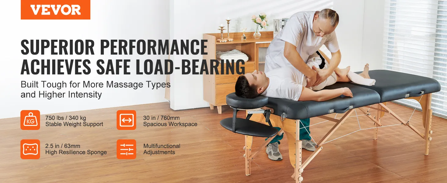 Robusta y resistente: fabricada con madera de haya y madera contrachapada espesa, la camilla de masaje profesional VEVOR de 30" W cuenta con una robusta capacidad de peso de 750 libras, con capacidad para 2 adultos. A pesar de su resistencia, pesa solo 36.4 libras y se pliega hasta 30 * 36,4 pulgadas, lo que lo hace portátil sin esfuerzo para uso en exteriores.