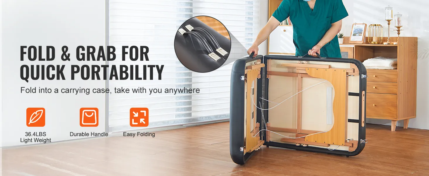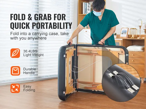 Pliégalo para facilitar su transporte. Cuando está plegada por la mitad, nuestra camilla de masaje plegable es tan compacta como una maleta, por lo que es fácil de llevar a donde quiera que vaya. Con un peso de sólo 36,4 libras y equipado con un mango duradero, se convierte en su compañero confiable para uso en exteriores.