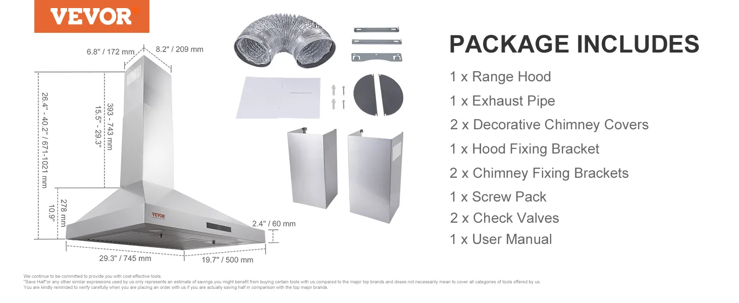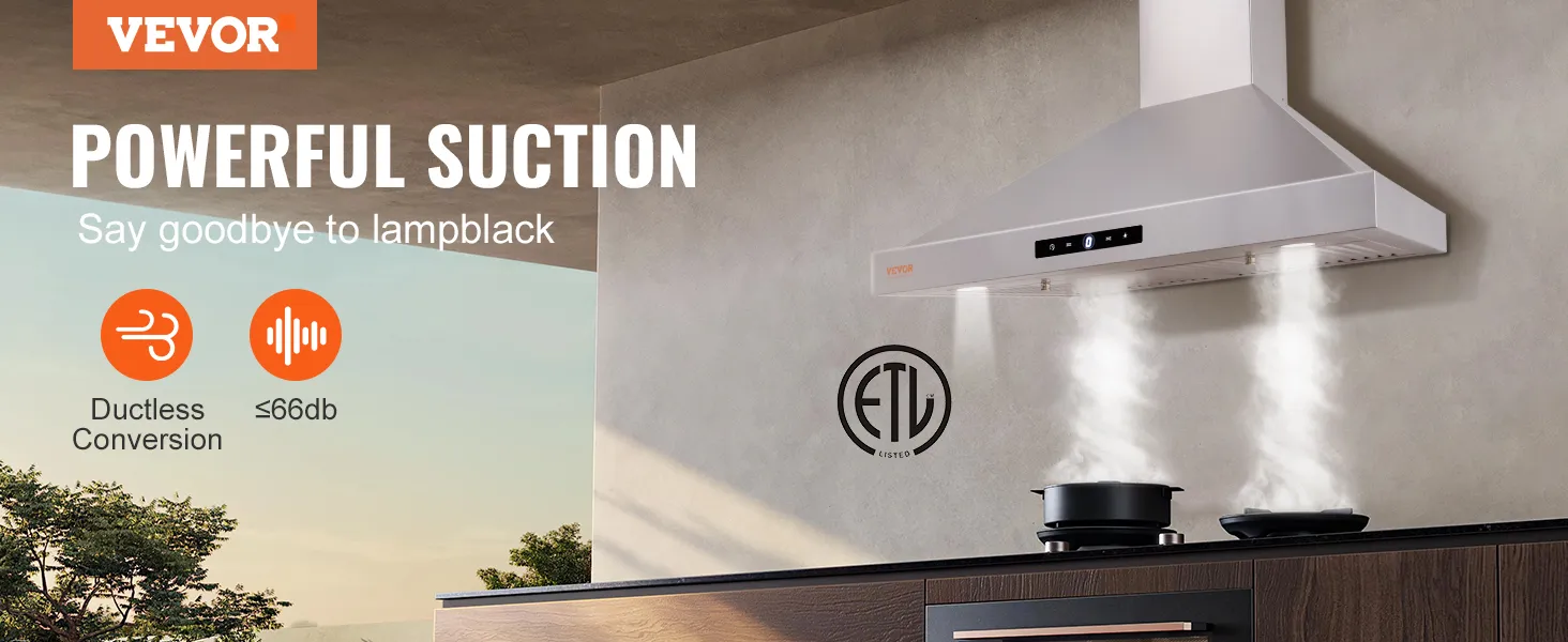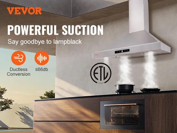 Potente succión: con certificación ETL, nuestra campana extractora está equipada con un motor de alta potencia para una succión fuerte y eficiente. Elimina eficazmente el humo, el vapor y los olores de la cocina. Mientras tanto, el nivel de ruido a la velocidad más alta es bajo, 66 dB, lo que le brinda una zona de cocción silenciosa.