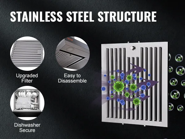 Acero inoxidable de primera calidad: el cuerpo principal de nuestra campana extractora está hecho de acero inoxidable, lo que proporciona alta resistencia y durabilidad. Es resistente al óxido y a la corrosión. El filtro permanente de acero inoxidable se puede lavar en el lavavajillas para una limpieza sin complicaciones.