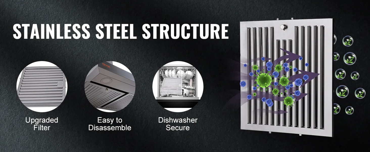 Esta campana extractora de cocina está fabricada con acero inoxidable para un uso prolongado. Tiene filtros mejorados que se pueden lavar en el lavavajillas para que puedas eliminar cualquier mancha de grasa o humo, asegurando un flujo de aire perfecto y una ventilación eficiente de toda la cocina.