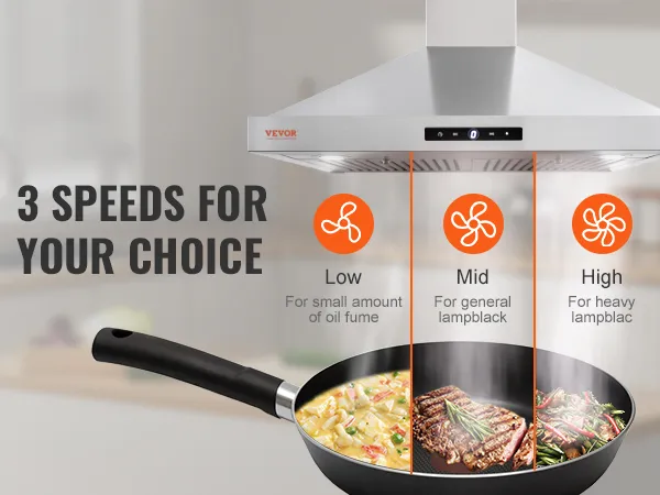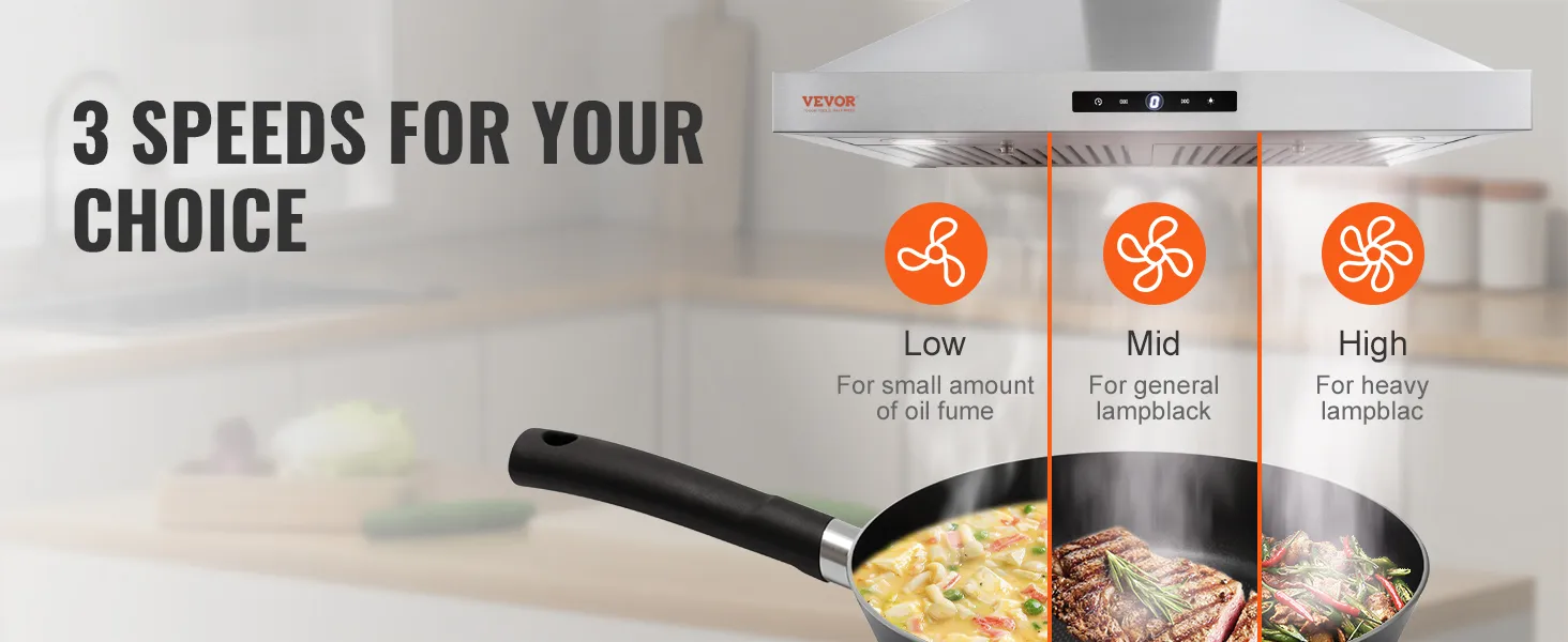 Tres velocidades del ventilador de extracción: múltiples configuraciones de velocidad del ventilador (baja, media y alta) pueden adaptarse a diferentes necesidades de cocción, lo que le permite personalizar el flujo de aire y la intensidad de la ventilación según el plato preparado.