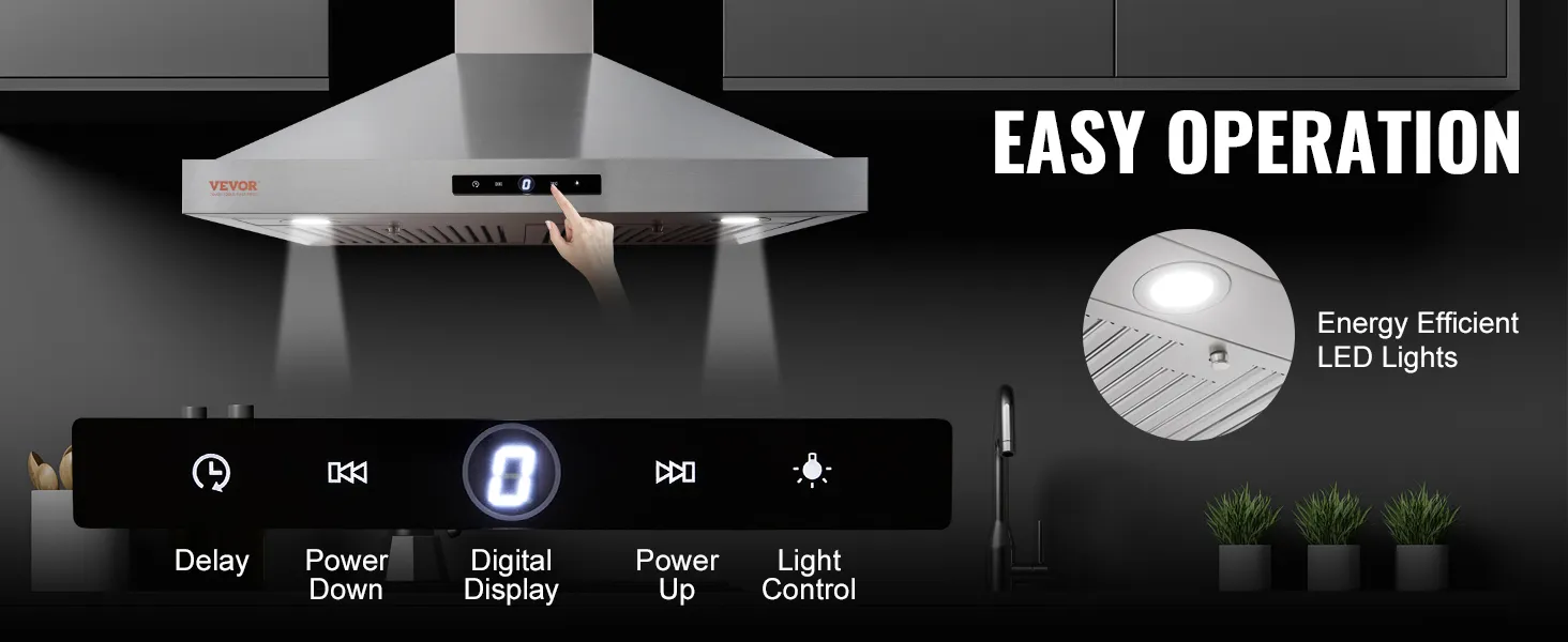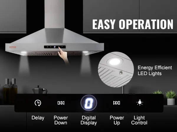 Panel de fácil operación: esta campana de ventilación adopta un control táctil inteligente, que se puede usar fácilmente tocando el modo que necesita. Dos luces LED pueden proporcionar luz adicional que pueda necesitar al cocinar.