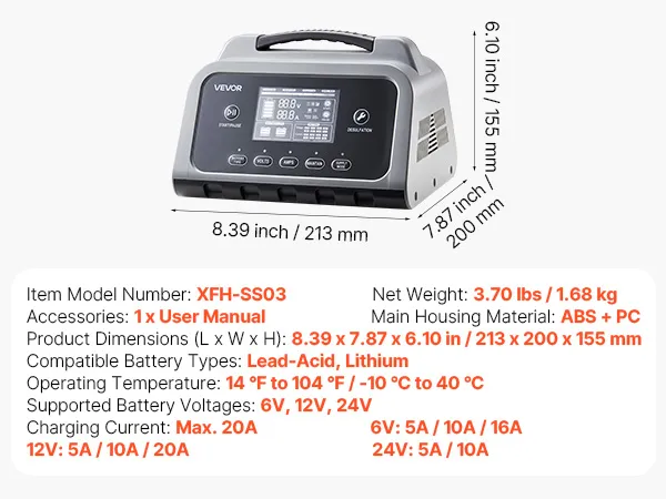 Cargador de batería de 20 A: Este cargador de batería inteligente es compatible con baterías de plomo-ácido de 6 V/12 V/24 V (húmedas/gel/MF/CA/EFB/AGM/calcio) y baterías LiFePO4 de 12 V/24 V. Salida de hasta 20 A con voltaje/corriente ajustables, además de modo profesional para baterías no estándar.