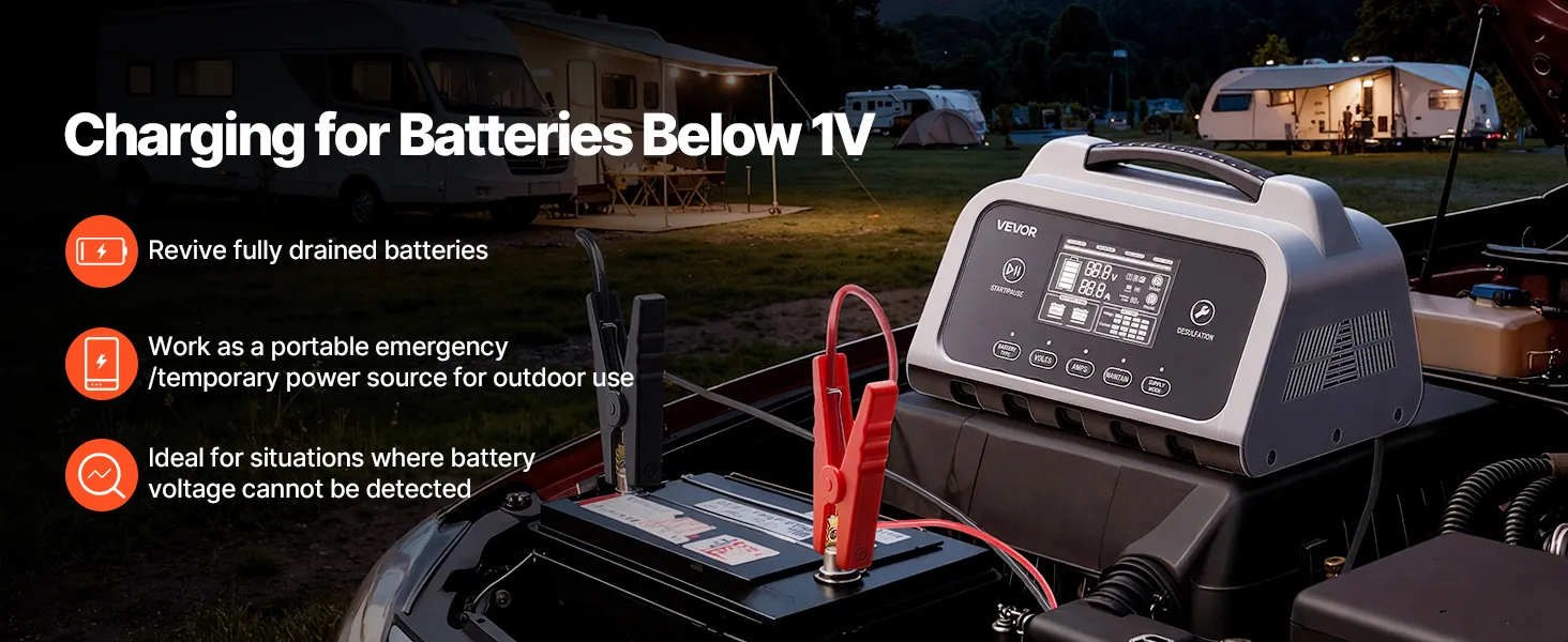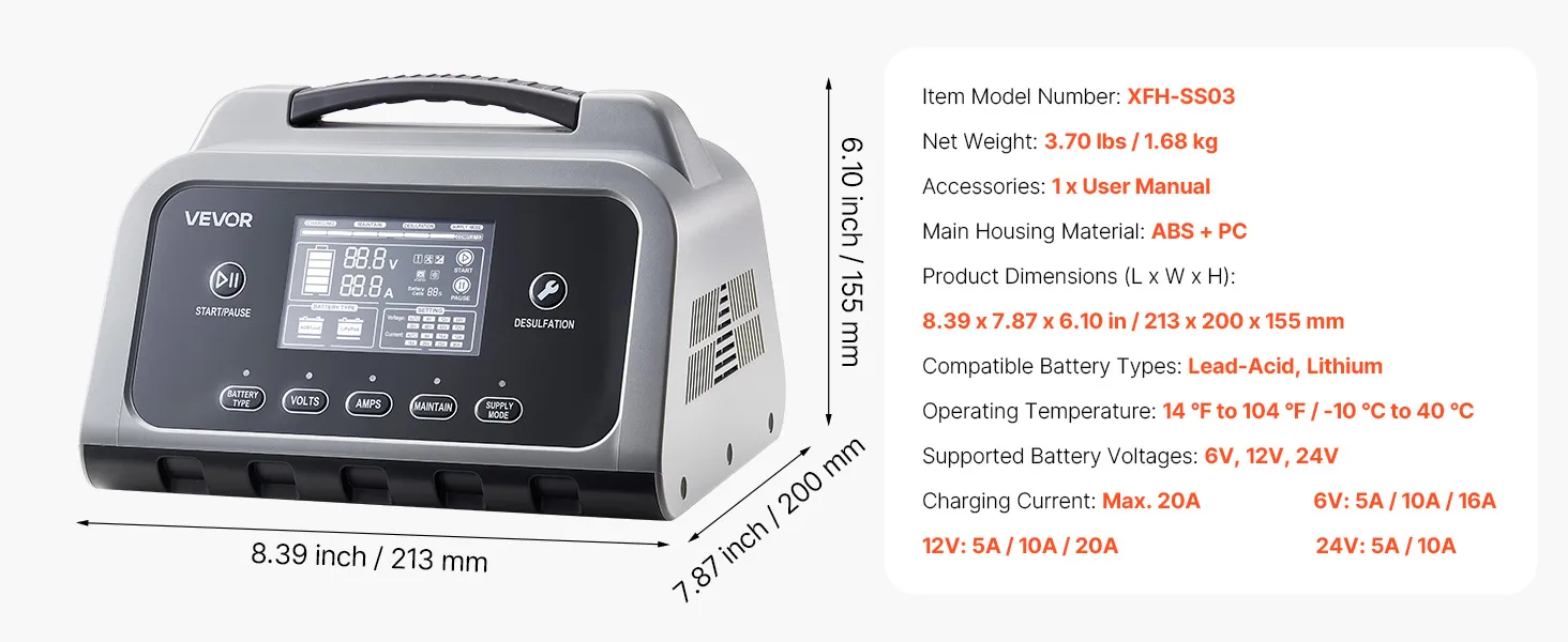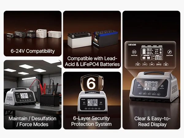 Cargador de batería inteligente VEVOR, 20 A, 6 V, 12 V, 24 V, LiFePO4, plomo-ácido (Gel/AGM), con pantalla LCD, mantenedor de carga lenta y desulfatador, para coche, barco, motocicleta y cortacésped.
