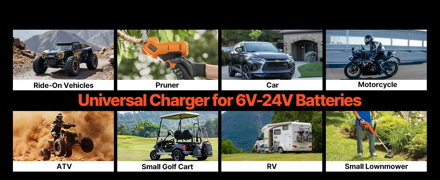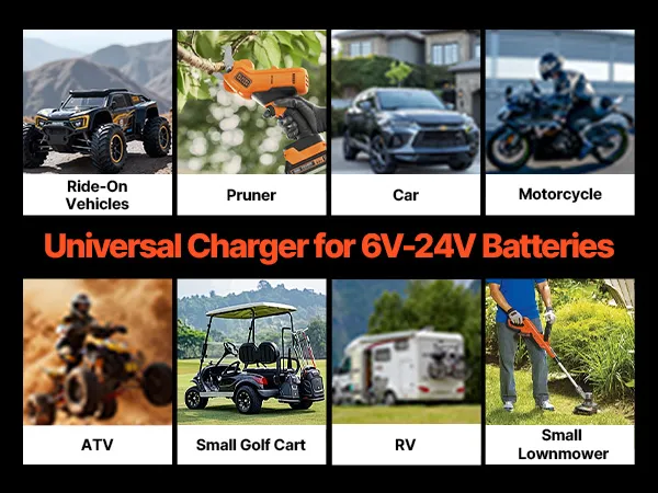 Amplia aplicación: un cargador de batería de litio LiFePO4 para equipos pequeños y grandes, ideal para vehículos de conducción, podadoras eléctricas, automóviles, motocicletas, vehículos recreativos, vehículos todo terreno, carritos de golf pequeños y cortadoras de césped compactas, que satisfacen todas sus necesidades de carga.