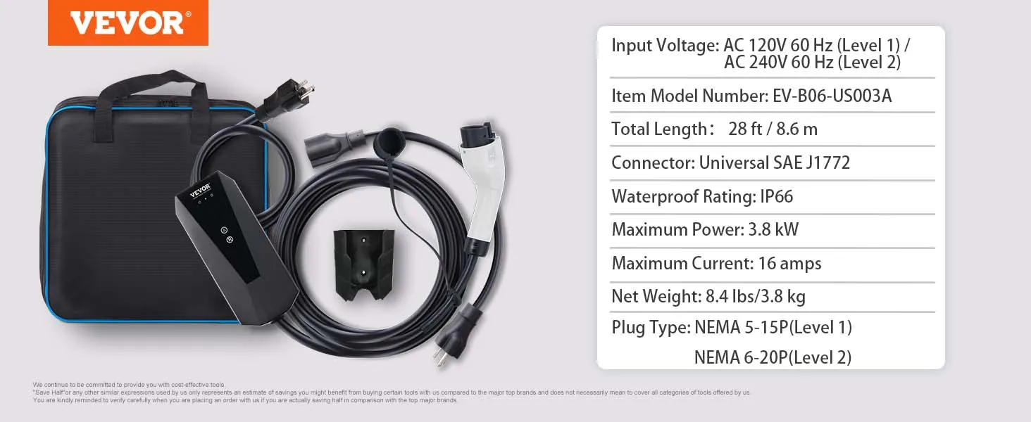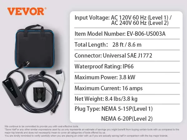 VEVOR Cargador EV portátil nivel 1+2, 16 Amp 120 V o 240 V, cargador de vehículo eléctrico con cable de carga de 28 pies NEMA 6-20P enchufe NEMA 5-15, estación de carga EV doméstica enchufable para SAE J1772 EV