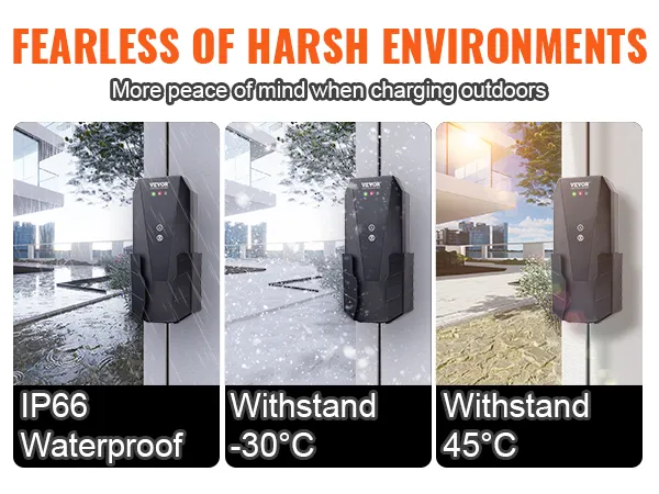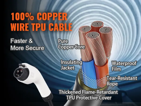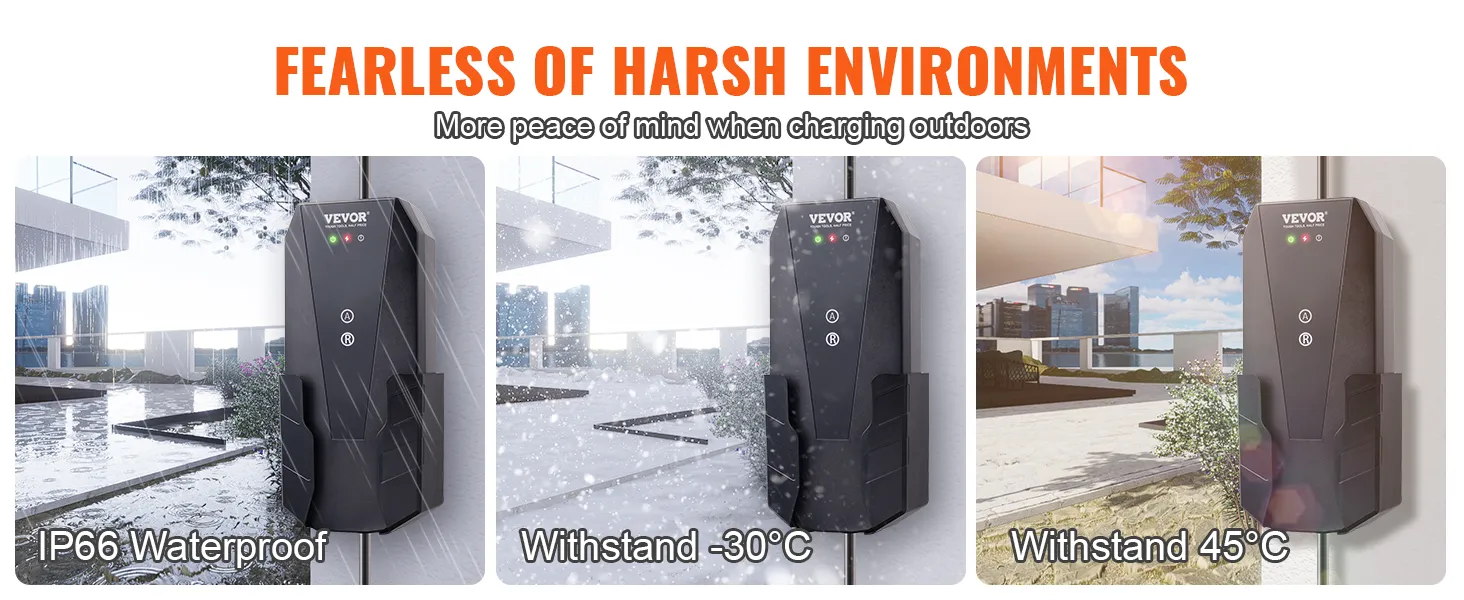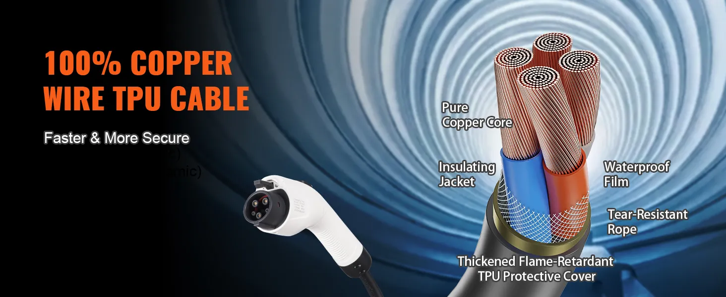Cable de carga extralargo: disfrute de la flexibilidad que incluye el cable de carga de 28 pies de largo con este cargador portátil para vehículos eléctricos. Puede cargar cómodamente su vehículo eléctrico en casa o utilizando estaciones de carga públicas sin problemas. Los cables de cobre internos garantizan una excelente conductividad y la cubierta protectora externa ignífuga de TPE está engrosada para mayor durabilidad. El cable de carga es resistente al agua y al polvo IP66 y soporta temperaturas de -30°C a 45°C.