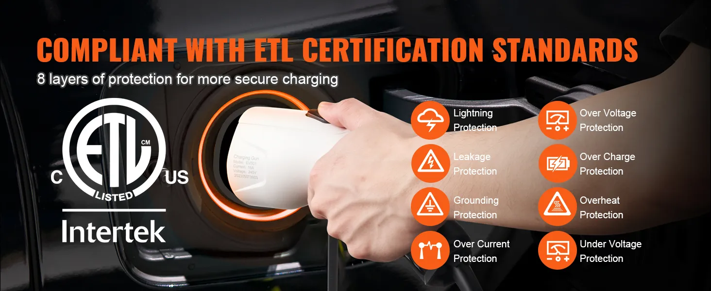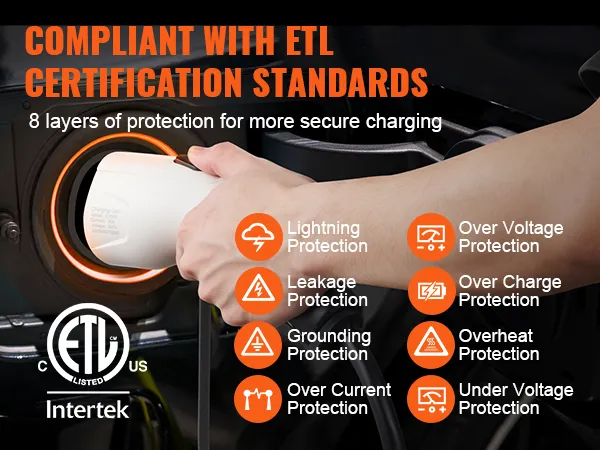 Protección integral: cumpla con los estándares de certificación de seguridad ETL. Durante la carga, el controlador del cargador portátil ajusta automáticamente la corriente según el estado de carga para evitar la sobrecarga. También proporciona protección contra rayos, fugas, conexión a tierra, sobretensión, subtensión, sobrecarga, sobrecorriente y sobrecalentamiento.