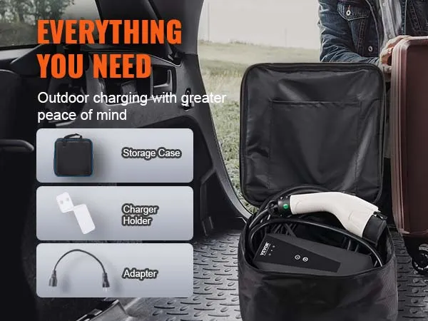 Funcionalidad de doble propósito: Nuestro paquete incluye una bolsa de almacenamiento rígida, una base, un gancho para el cable de carga y un adaptador, lo que brinda una funcionalidad versátil. Usando la base y el soporte del cargador, puede instalar fácilmente este cargador como una estación de carga fija en su garaje. Simplemente guarde el cable de carga en la bolsa de almacenamiento incluida para cargarlo mientras viaja y llévelo con usted. Puedes cargar tu vehículo eléctrico dondequiera que haya una toma de corriente disponible.