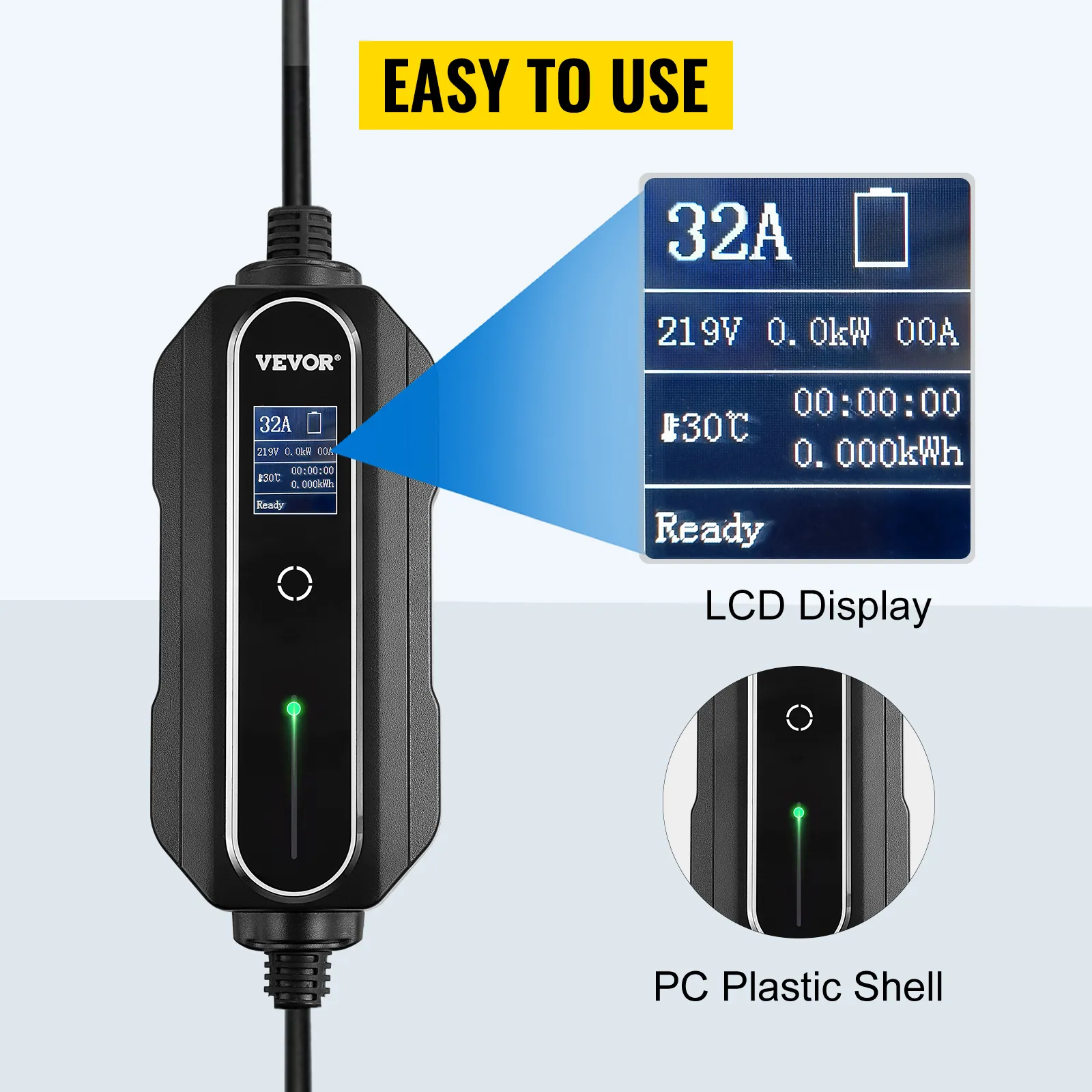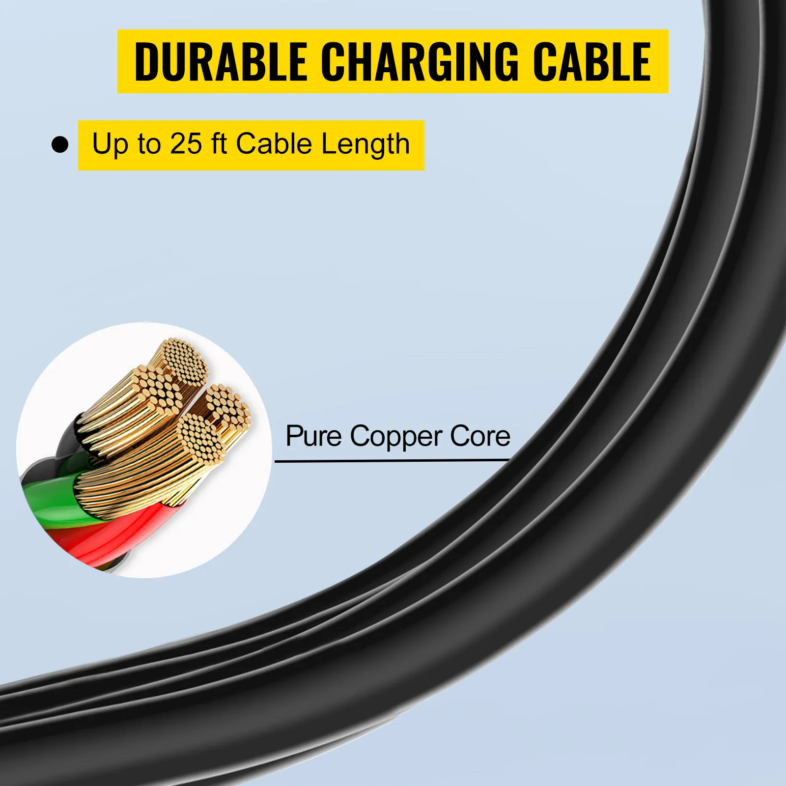 El cargador para vehículos eléctricos VEVOR tiene un cable de carga J1772 de 25 pies que está hecho de cobre puro en su interior. Ayuda a que la electricidad fluya sin problemas. El material exterior de este cable puede soportar temperaturas bajas de -22 ℉/-30 ℃. Entonces, hazte con este cargador para vehículos eléctricos de nivel 2 si buscas una calidad superior.
