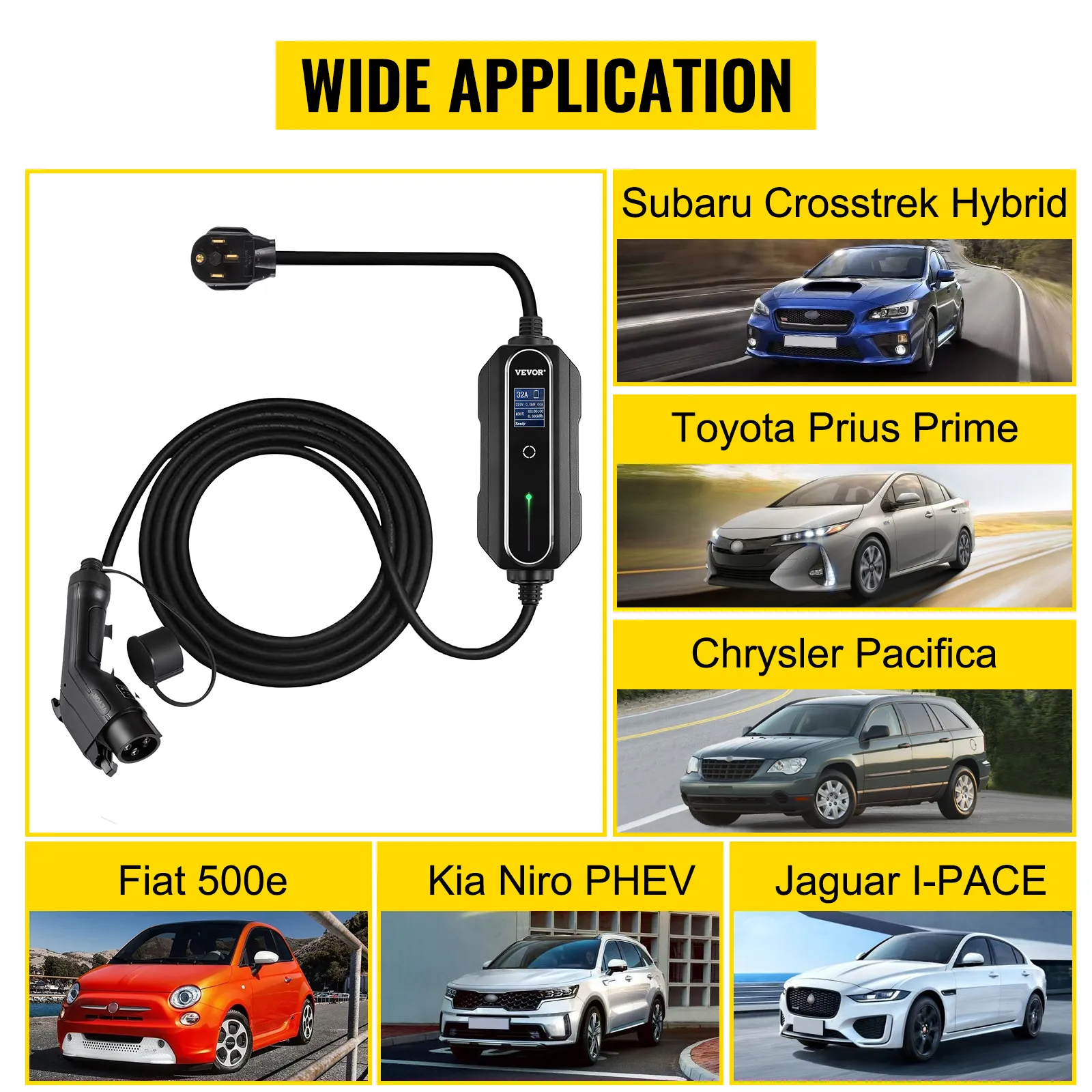 El cargador portátil para vehículos eléctricos VEVOR es compatible con diferentes modelos y marcas de automóviles y cumple con el estándar SAE J1772. Puede conectarlo al Toyota Prius Prime, Honda Clarity Electric, Chevrolet Bolt EV, Nissan Leaf S, Hyundai Ioniq Electric, Ford C-Max Energi, BMW 5 Series 530e y más.