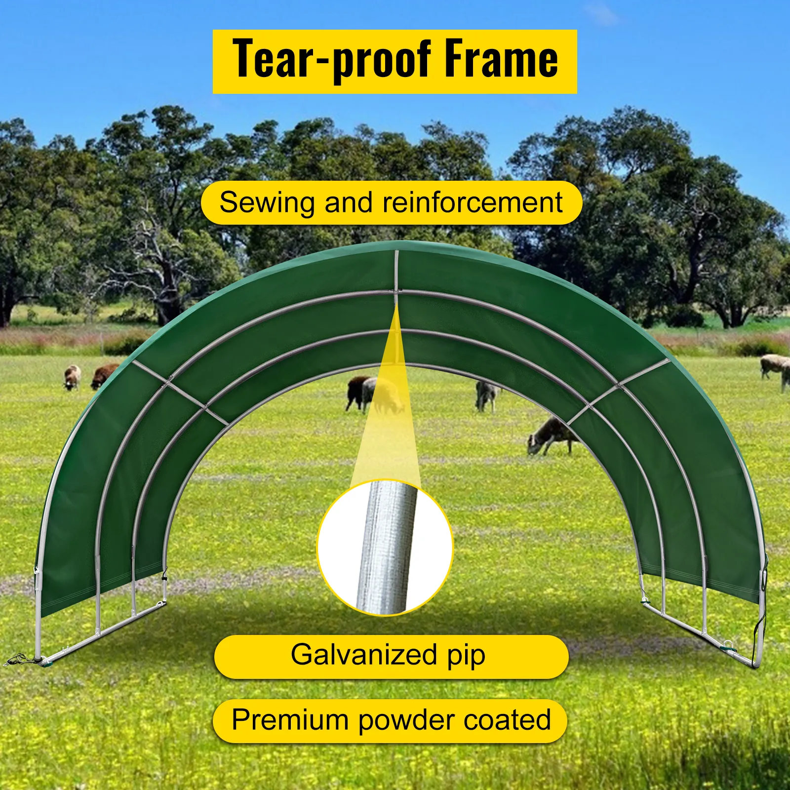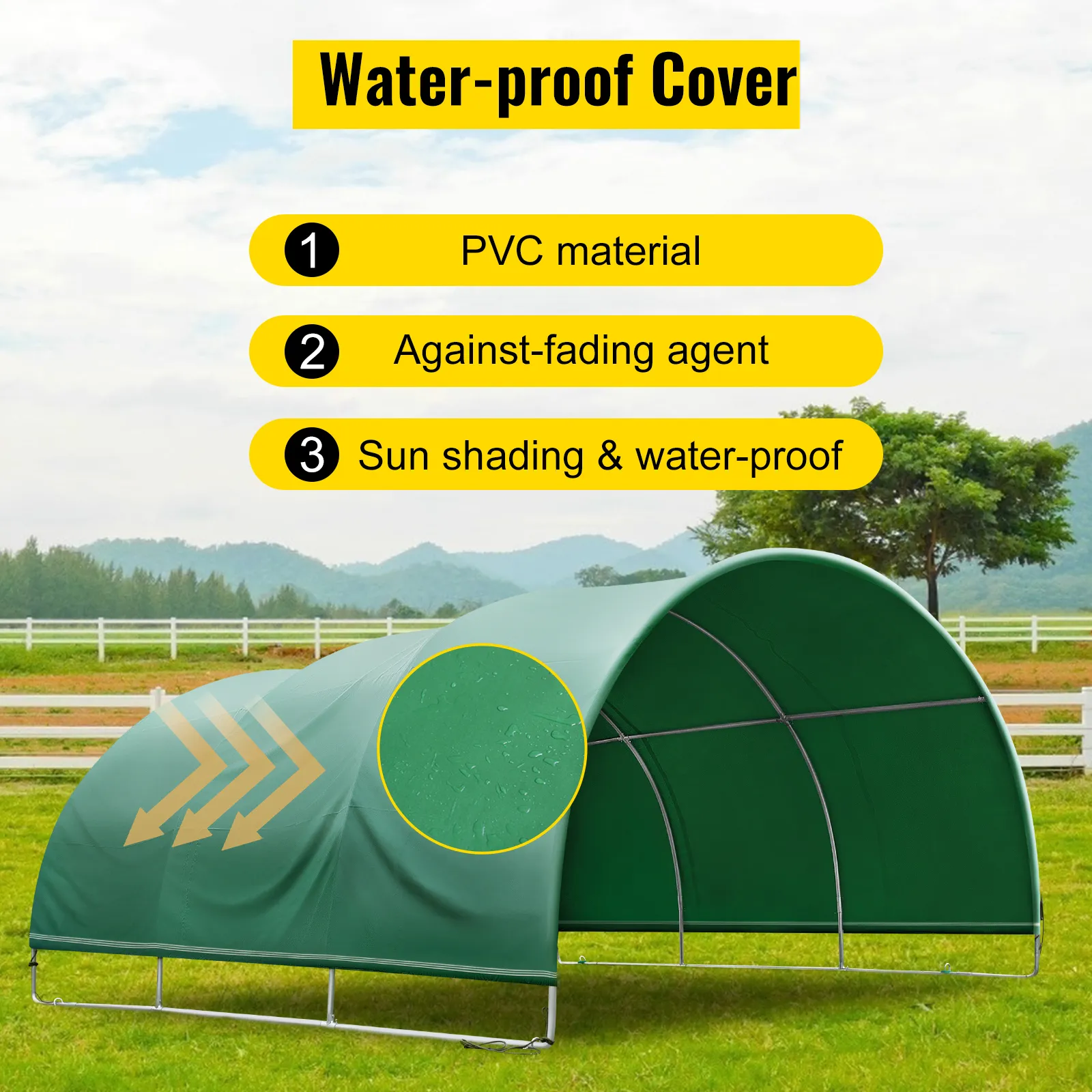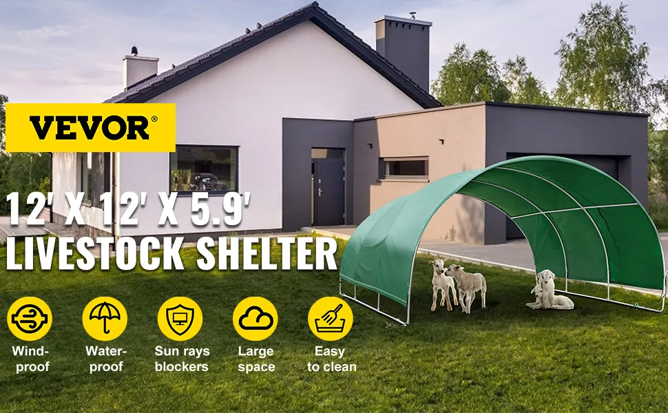 Con material de PVC, tratamiento de protección solar y agentes antidecoloración, la cubierta de su corral será impermeable, funcionará durante mucho tiempo y seguirá luciendo como nueva. El refugio creará una fuerte barrera entre la luz solar y el ganado.