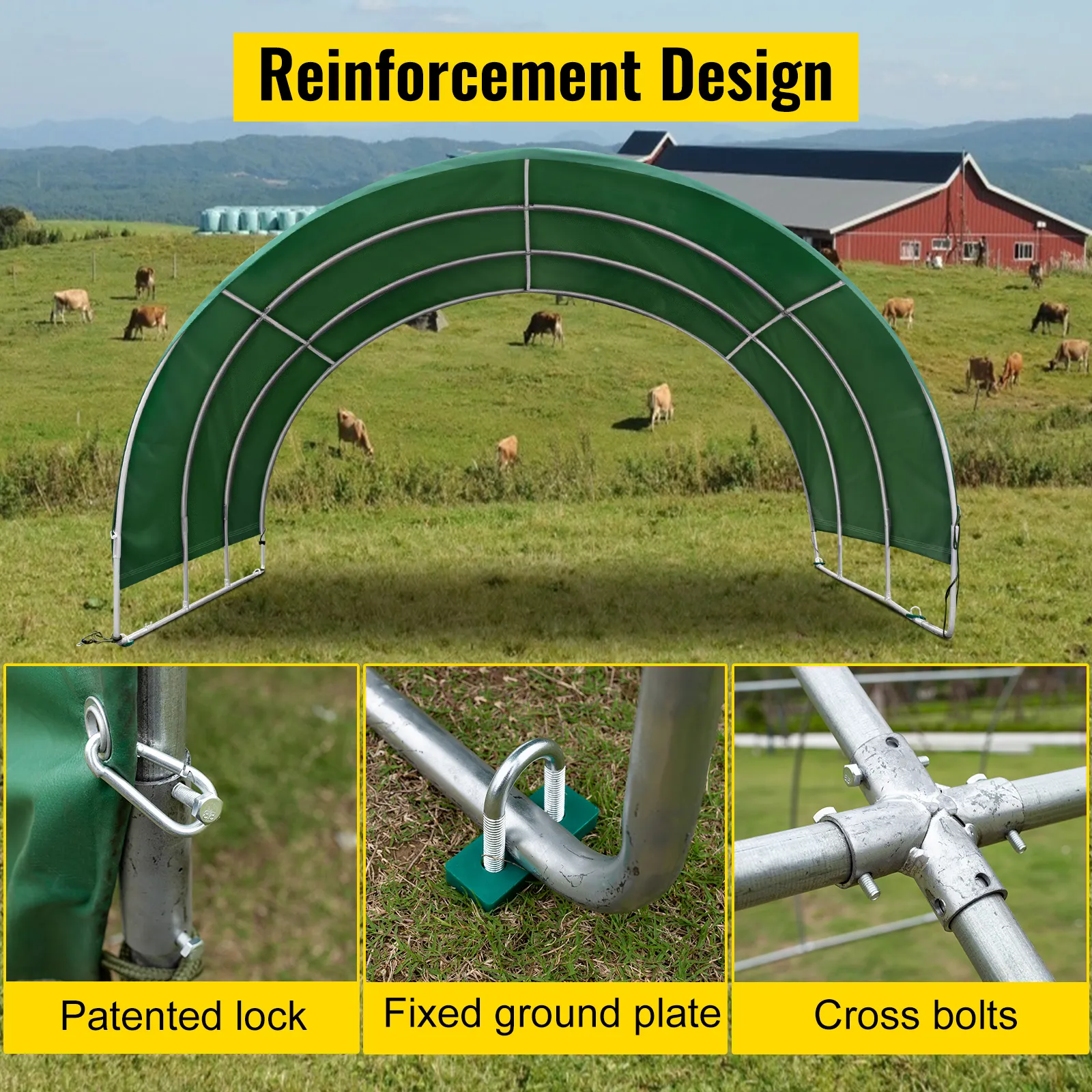 El refugio con costuras alrededor utiliza un fijador de suelo para asegurar toda la carpa. Con marcos de bloqueo de acero patentados, se creará un refugio de paneles de corral estable y seguro para su ganado, incluso con mal tiempo.