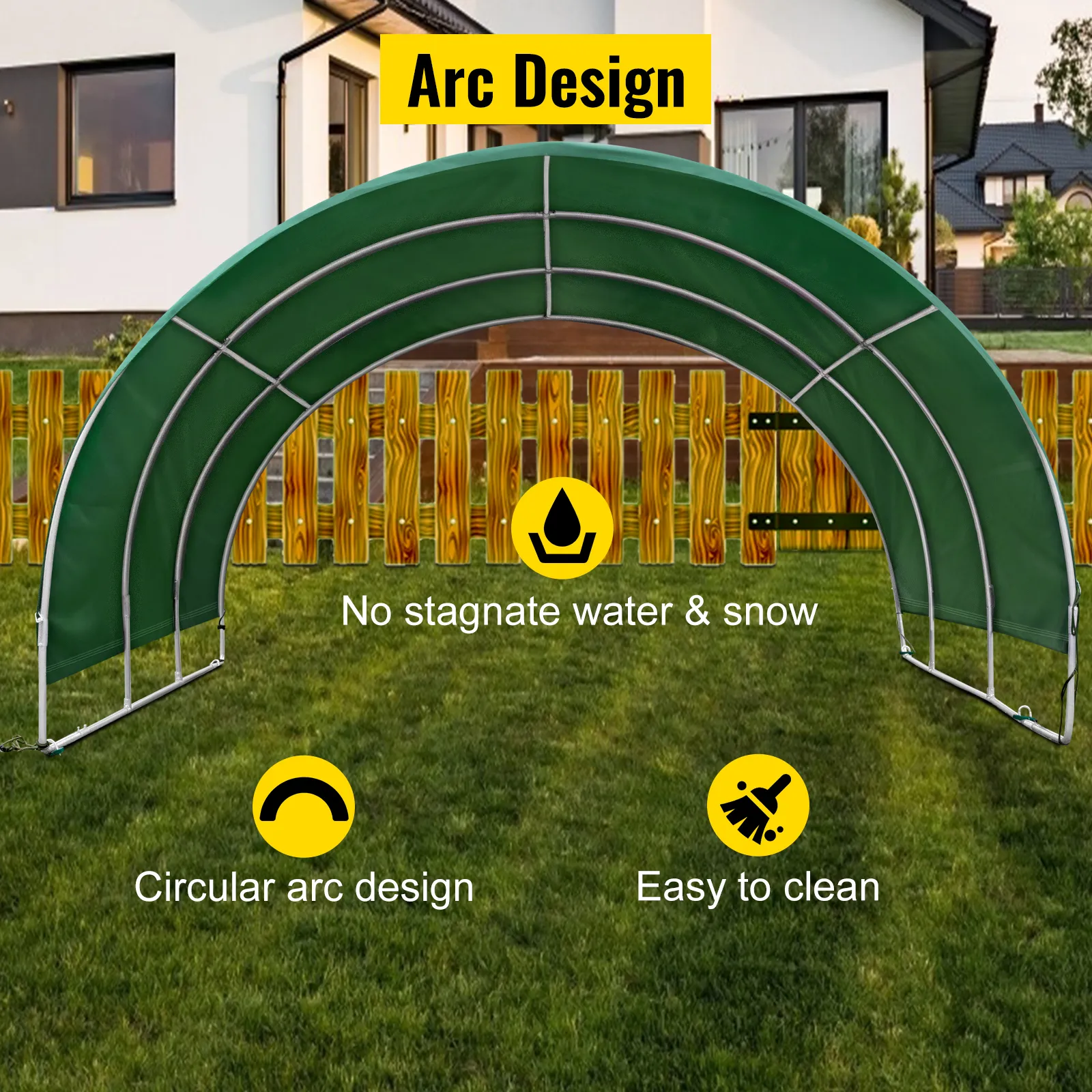 Será más conveniente limpiar el agua y la nieve en la cubierta superior con un diseño de arco circular. Nuestra carpa proporcionará un refugio limpio y cómodo con paneles de corral para sus caballos, cabras y otros animales.