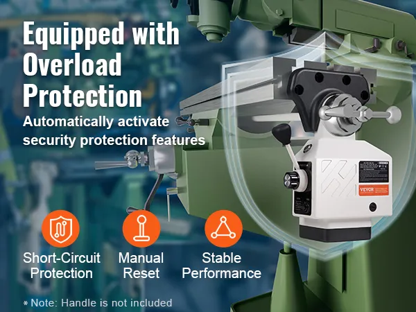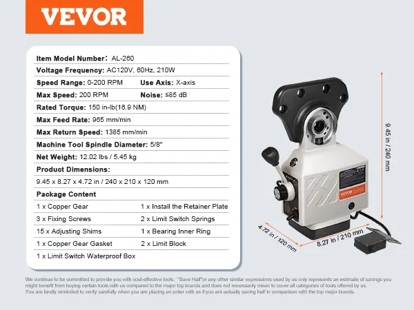 Alimentador de fresadora VEVOR con eje X, par de 150 in-lb, velocidad de rotación ajustable de 0 a 200 RPM, 120 V, para fresadoras Bridgeport de tipo rodilla con eje de 5/8" de diámetro.