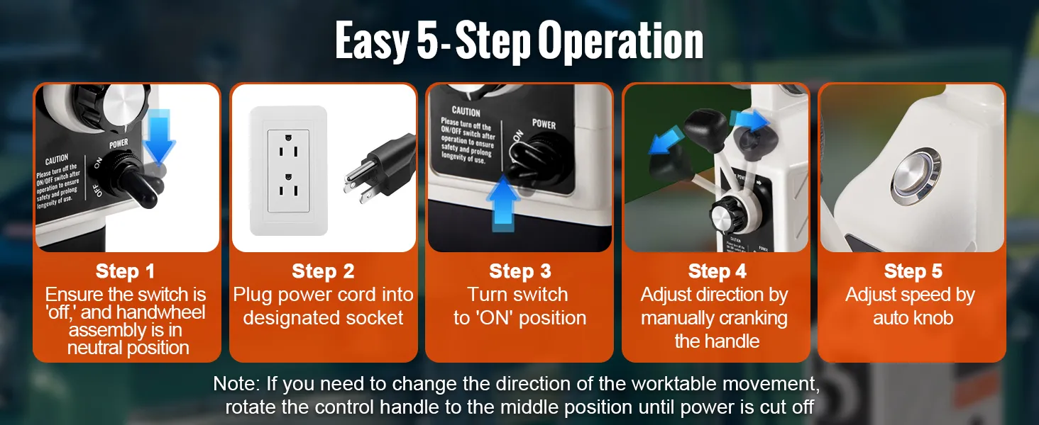 Nuestra mesa de alimentación eléctrica ofrece una relación de transmisión estable y una alta capacidad de carga. Controle la velocidad fácilmente con la palanca manual y la perilla automática. Ideal para máquinas con eje de 5/8'' de diámetro y fresadoras de eje X. ¡Experimente una eficiencia y fiabilidad sin precedentes!
