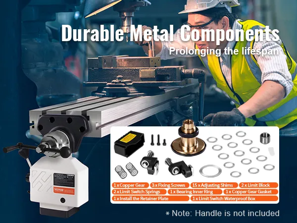 Nuestra fresadora de alimentación eléctrica viene con un conjunto de piezas de metal resistentes que están diseñadas para durar, que incluyen 1 x engranaje de cobre, 1 x placa de retención de instalación, 3 x tornillos de fijación, 2 x resortes de interruptor de límite, 15 x calzas de ajuste, 1 x anillo interior de cojinete y 1 x junta de engranaje de cobre.