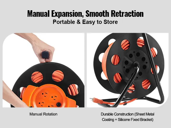 Portátil y fácil de guardar: El carrete de cable extensible es fácil de instalar y usar. Se extiende y retrae manualmente, se rebobina suavemente y se bloquea fácilmente. El soporte metálico ayuda a mantener el carrete en posición vertical y el asa facilita su transporte. Puede llevarse a la obra o usarse en el garaje, ocupando un espacio mínimo.