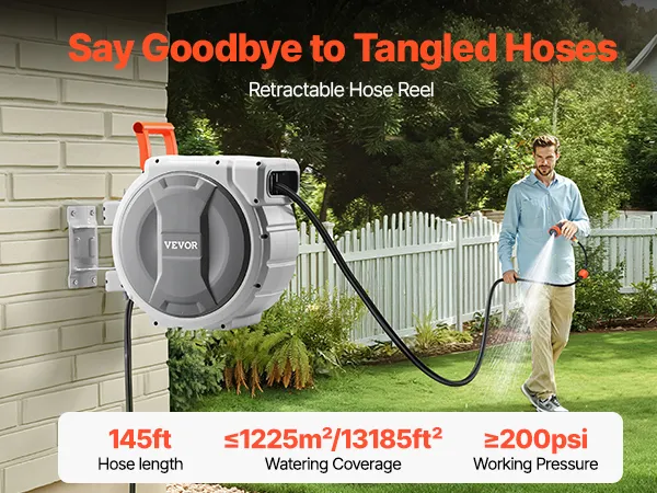 Wide Coverage: With a 145 ft hose and 6 ft lead hose, this hose reel covers up to 13185 ft²/1225㎡, making it ideal for large gardens or distant areas without frequent reel movement. The patented ratchet locking system lets you pull the hose and lock it at any desired length for precise watering.