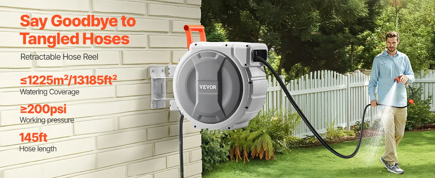 VEVOR Retractable Garden Hose Reel, 1/2 Inch x 145 ft Wall Mounted Hose Reel, Heavy Duty Garden Hose Reel with 9 Patterns Nozzle, Any Length Lock, Upgraded Slow Return System and 180°Swivel Bracket