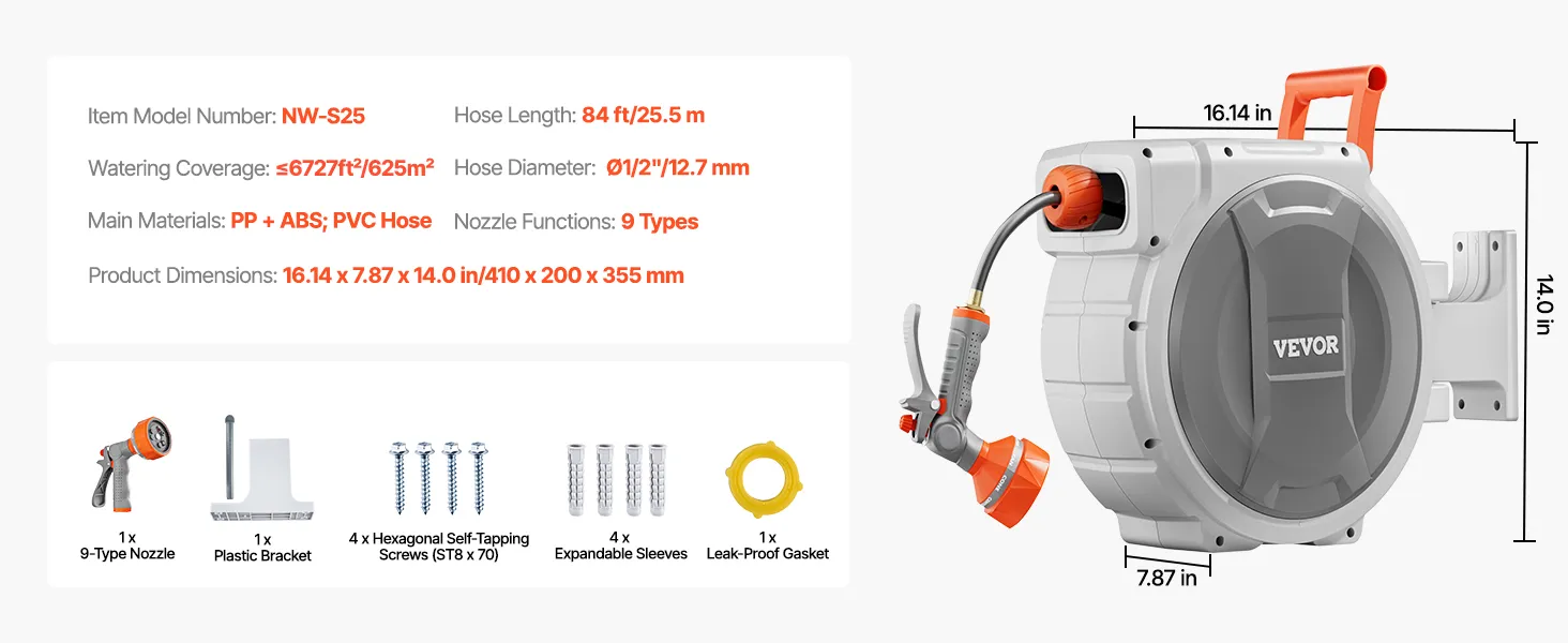 A los usuarios en línea les encanta su diseño compacto pero práctico, que cabe en espacios pequeños y se puede usar en condiciones de uso intenso. A la mayoría les impresiona que ahorra tiempo y evita la molestia innecesaria de enrollar o reemplazar la manguera manualmente. En comparación con los carretes Hoselink o los modelos Eley, más caros, VEVOR ofrece una excelente relación calidad-precio.