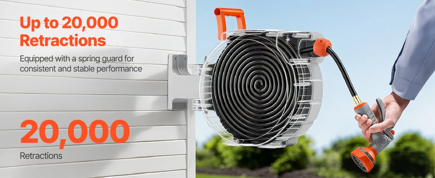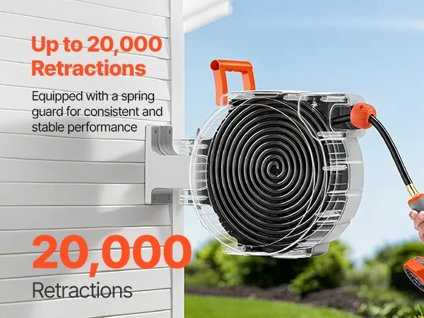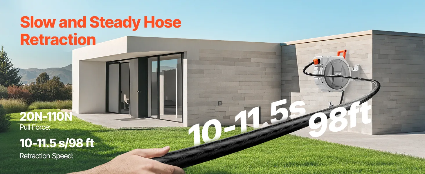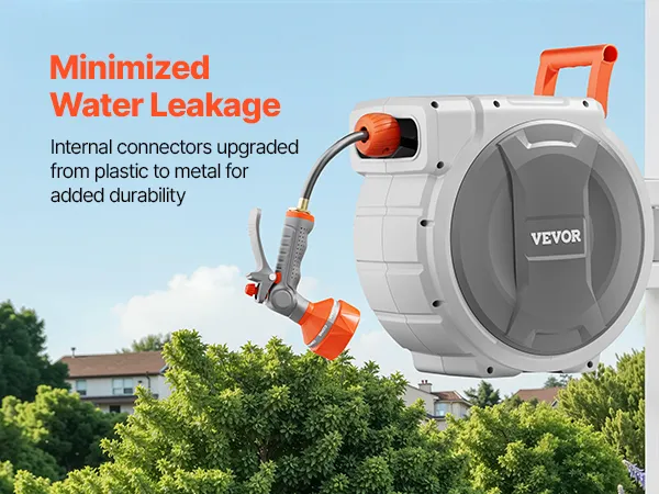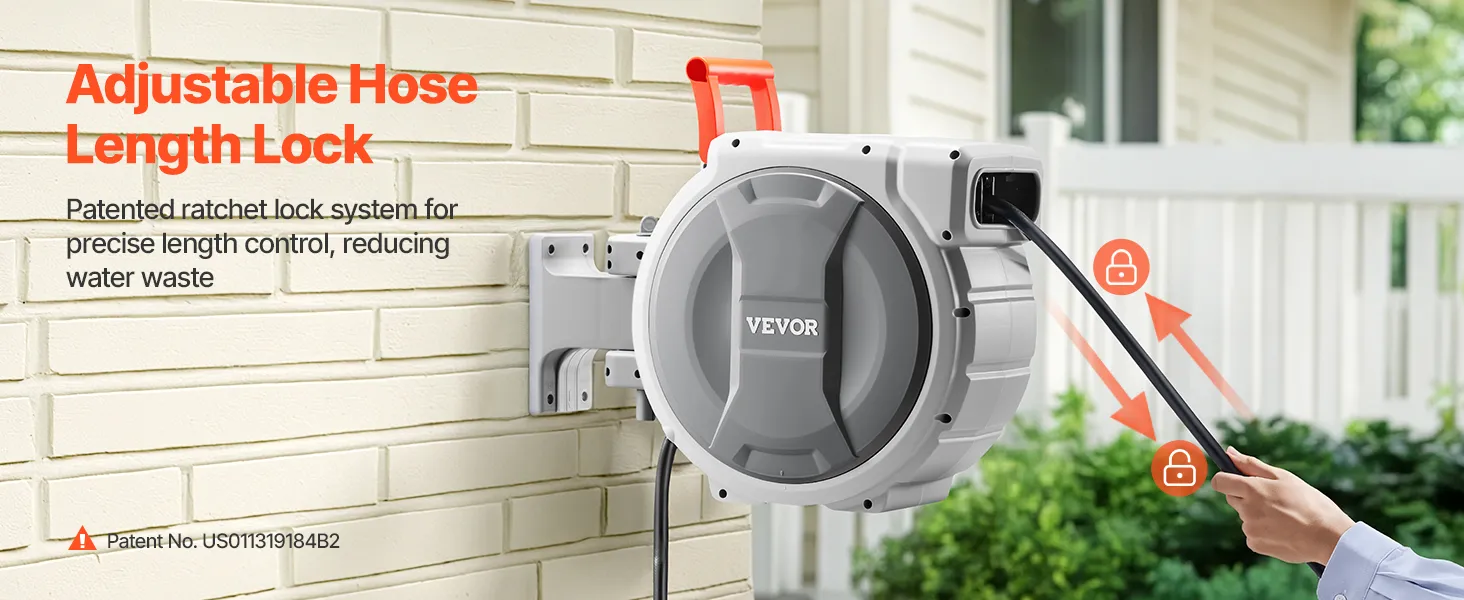 La manguera cuenta con un mecanismo de bloqueo. Tirar de la manguera hasta la longitud deseada para bloquearla de forma segura y retirarla requiere un esfuerzo mínimo por parte del usuario. La manguera VEVOR se enrolla uniformemente en el carrete, evitando dobleces, enredos y un enrollado desigual que pueda bloquear el flujo y provocar fugas. Los carretes equipados con estas características tienen una alta fiabilidad.