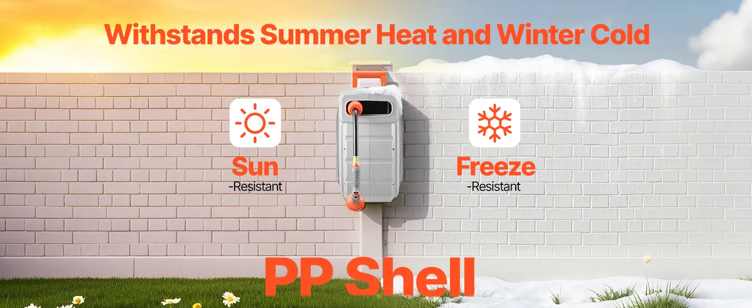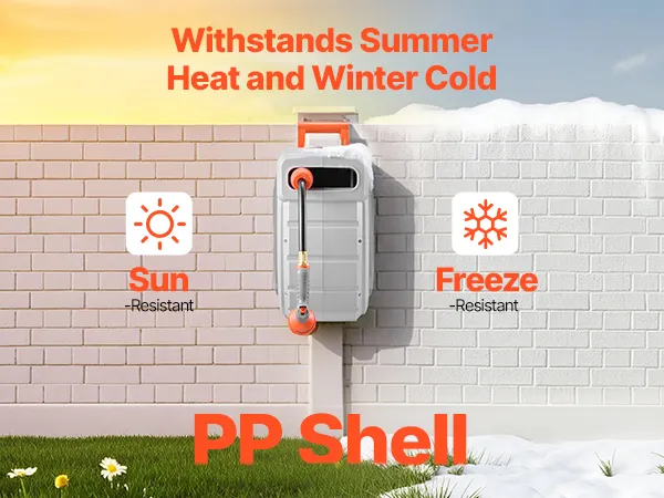 El material de este carrete es resistente al uso en exteriores. Está fabricado con acero resistente y cuenta con mangueras de PVC de triple capa que lo protegen de la intemperie y de los ciclos de congelación y descongelación, previenen la oxidación y garantizan una larga vida útil. Los clientes comentan que presenta muy pocas torceduras y cero fugas después de un uso frecuente.