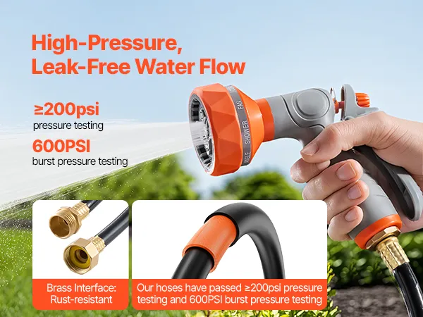 La manguera de alta resistencia VEVOR está fabricada con accesorios de latón sin plomo y piezas de acero y plástico. Diseñada para resistir la oxidación, esta unidad es de máxima calidad y seguridad. Los conectores de latón son aptos para agua potable y resistentes a fugas. Ideal para usuarios de patio, jardineros o cualquier persona que requiera presión de agua variable.
