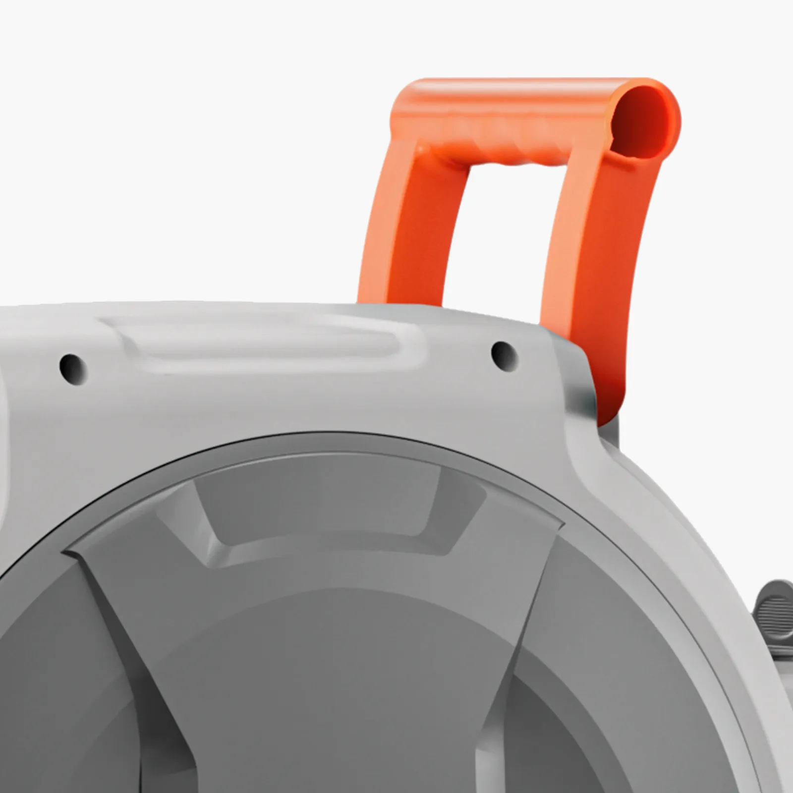 El soporte y los herrajes de montaje integrados facilitan su instalación en paredes de ladrillo, madera u hormigón, proporcionando una base robusta para el uso diario en el jardín. Una vez instalado, el carrete gira 180° gracias a su brazo giratorio, lo que permite a los usuarios un acceso flexible al agua en todo el jardín. Su sistema de guía integrado ayuda a enrollar la manguera de forma uniforme en todo momento, evitando enredos y garantizando una retracción suave.