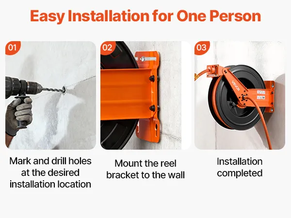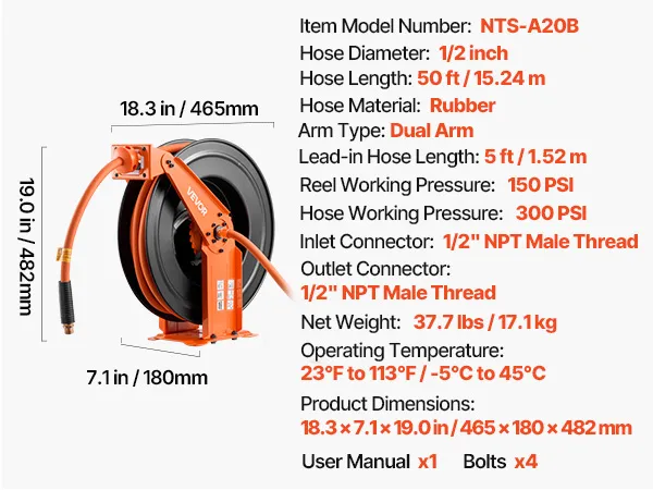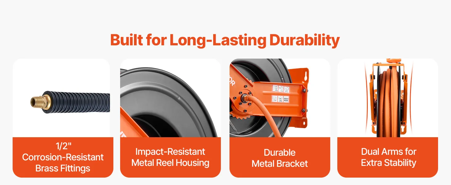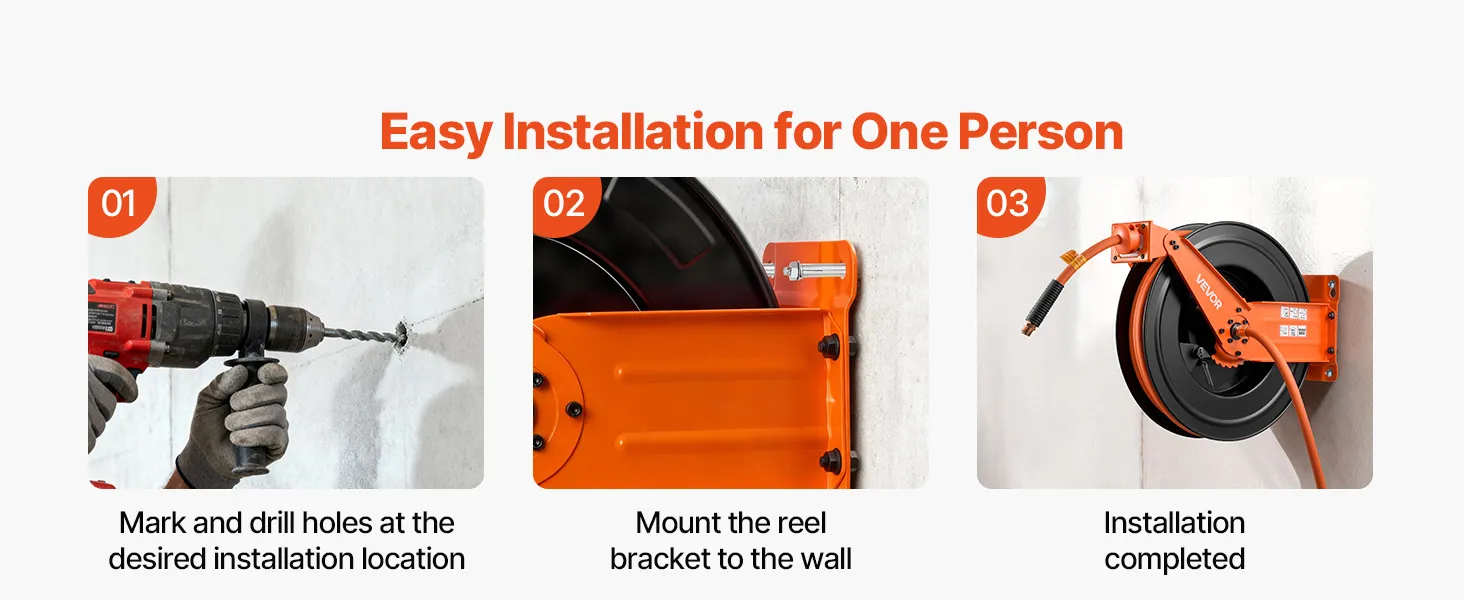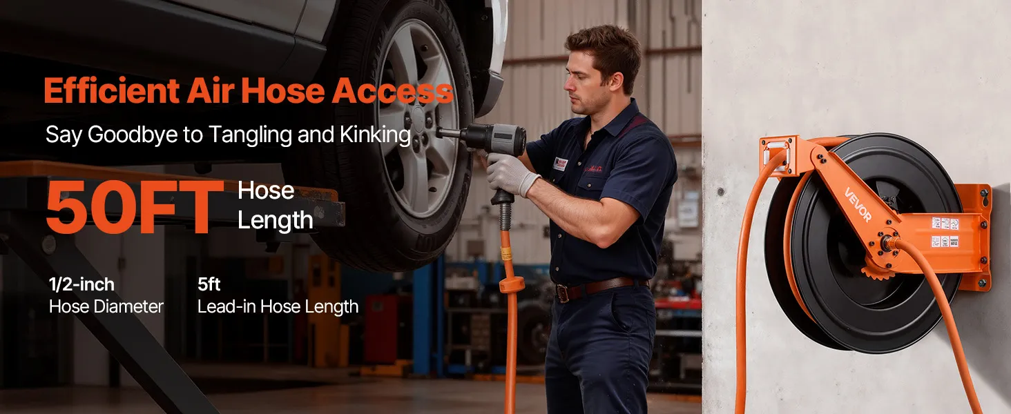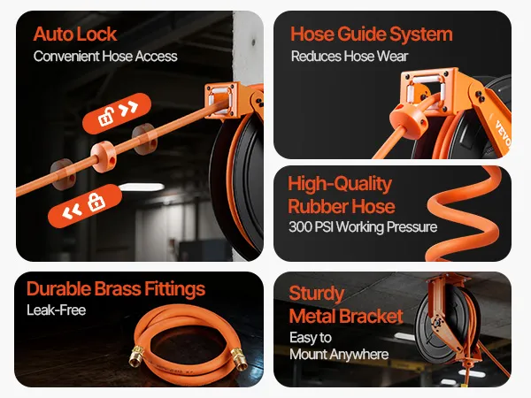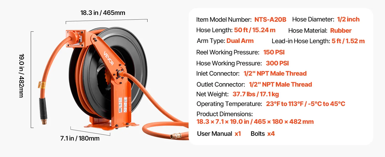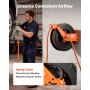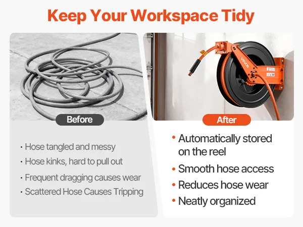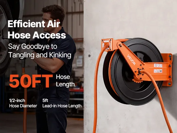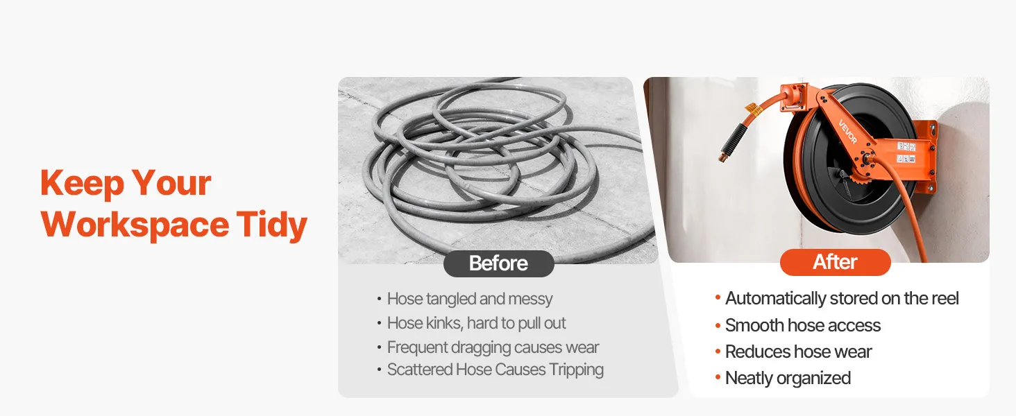 Mangueras enredadas: El carrete retráctil de manguera de aire VEVOR incluye una manguera de aire de goma de 1,27 cm x 15,24 m y una manguera de entrada de 1,52 m para mantener su espacio de trabajo ordenado y sin enredos. Olvídese de las mangueras arrastradas por el suelo, lo que reduce el desgaste y el riesgo de tropiezos para un uso más seguro.
