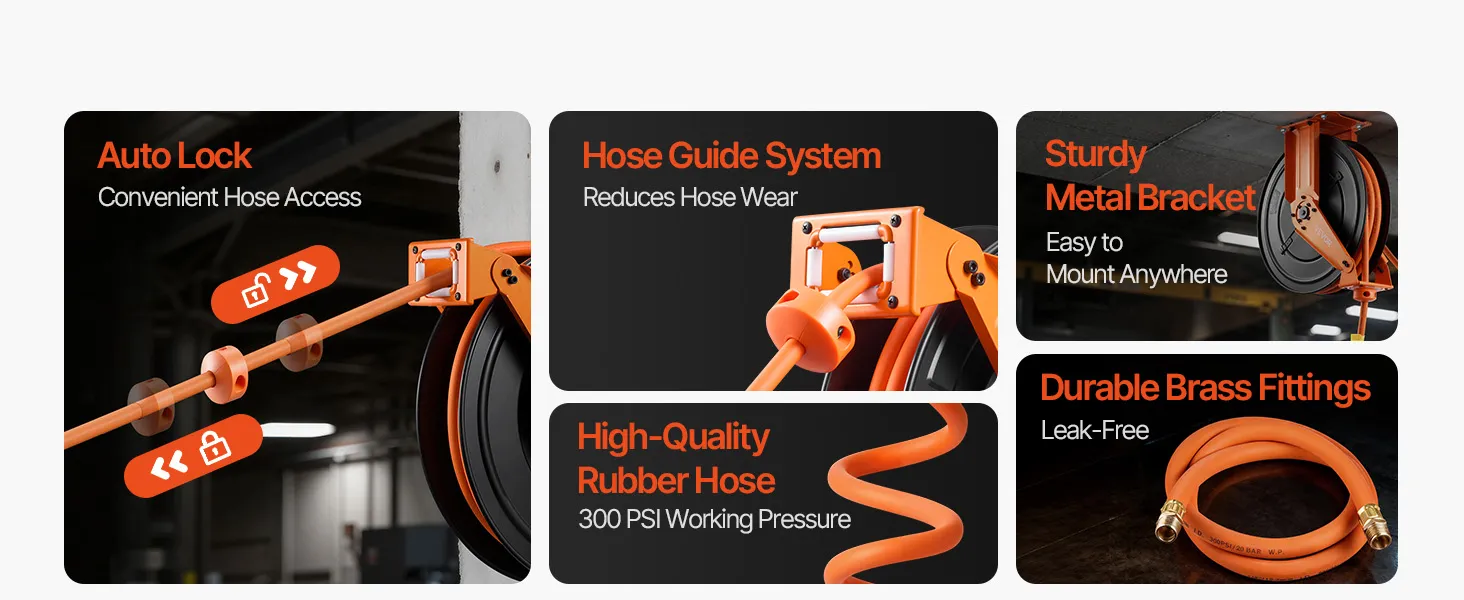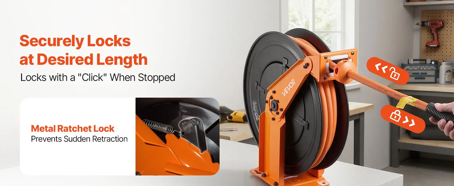 Nuestro carrete de manguera de aire con rebobinado automático cuenta con un mecanismo de bloqueo incorporado que le permite ajustar la longitud de la manguera fácilmente y bloquearla de forma segura en la posición deseada.