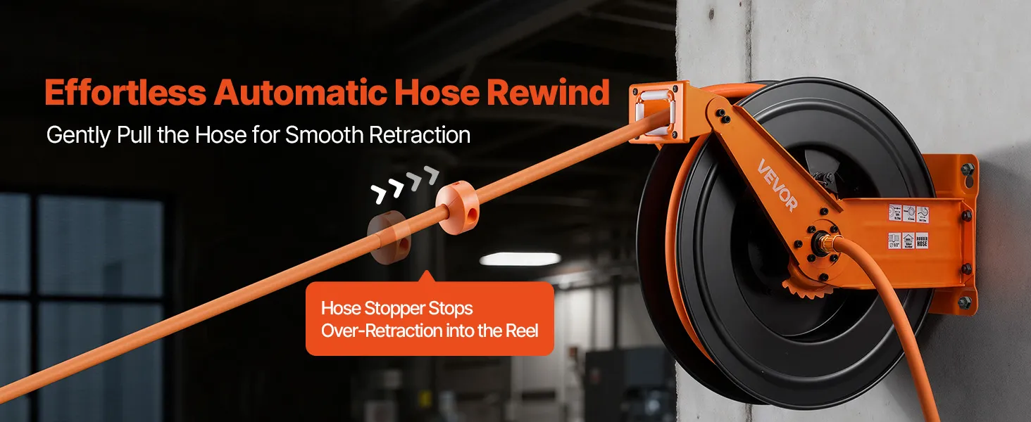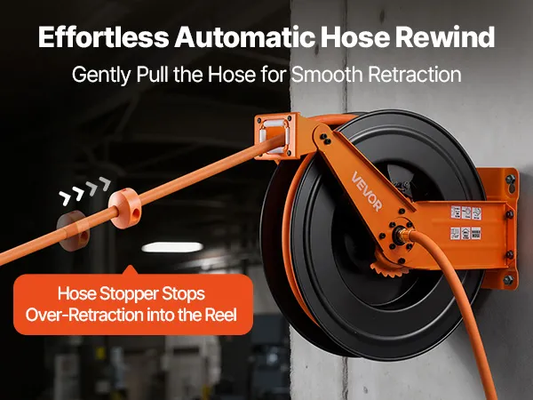 Rebobinado automático: Gestione su manguera fácilmente con el sistema de rebobinado automático: simplemente tire suavemente y se rebobinará suavemente. El tope ajustable y el seguro de trinquete integrado le permiten asegurar la manguera a cualquier longitud, y los rodillos antienganches la guían uniformemente para reducir el desgaste.