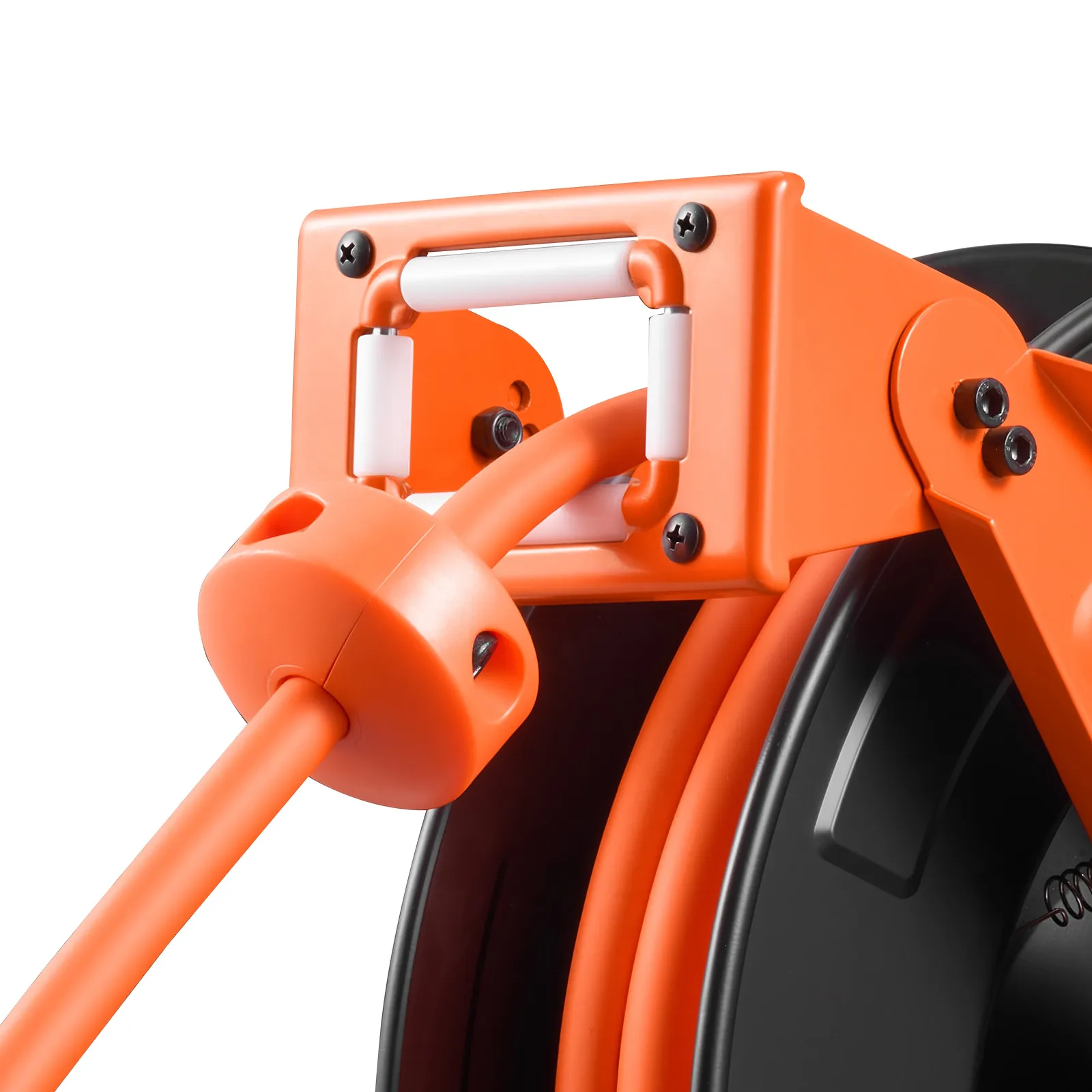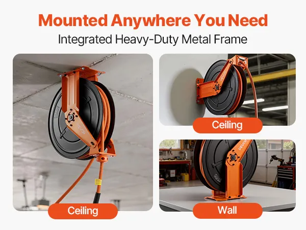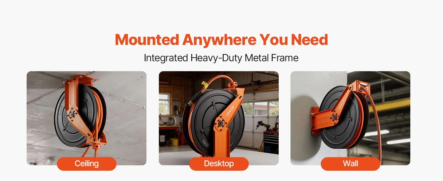 Doble brazo para una gran estabilidad: El carrete de acero de doble brazo de alta resistencia proporciona un soporte sólido en ambos lados, manteniendo la manguera más estable durante la extensión y la retracción. Se puede montar en techos, paredes o bancos de trabajo, manteniendo la manguera de aire al alcance de la mano sin que se doble.