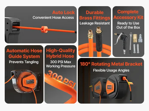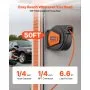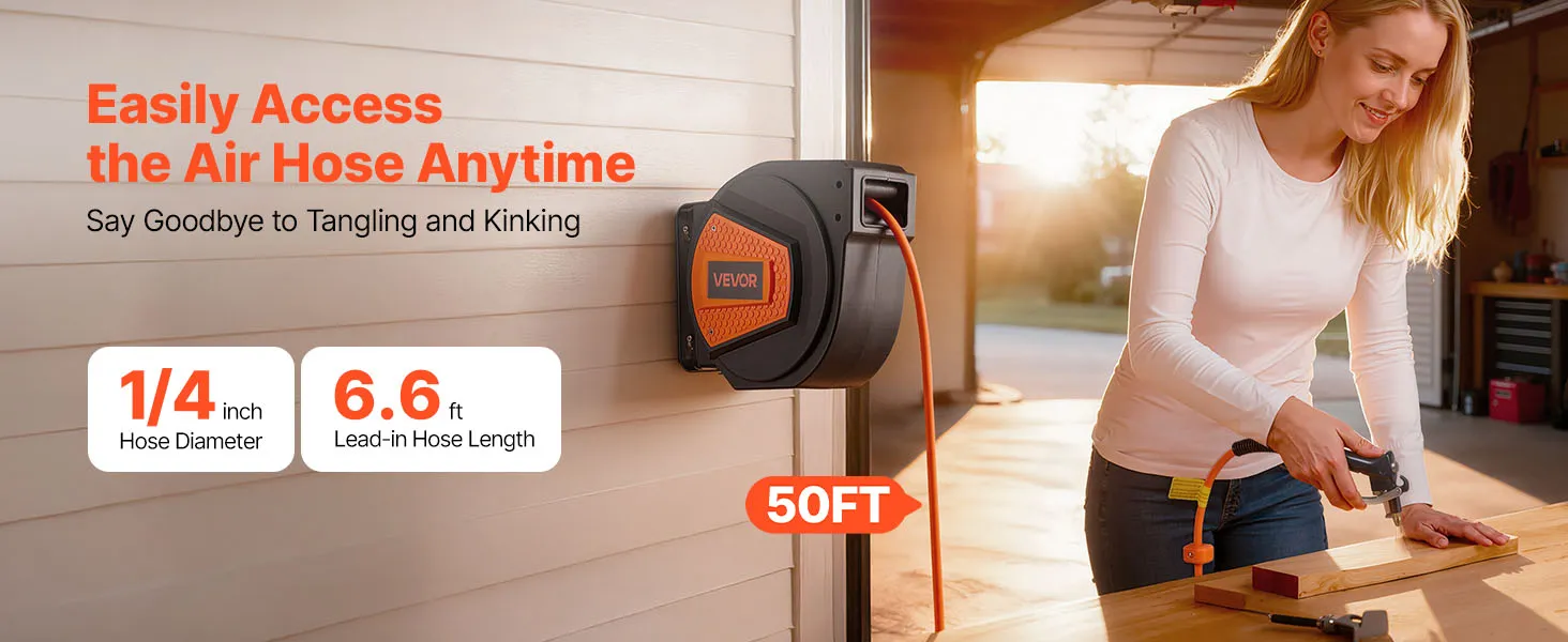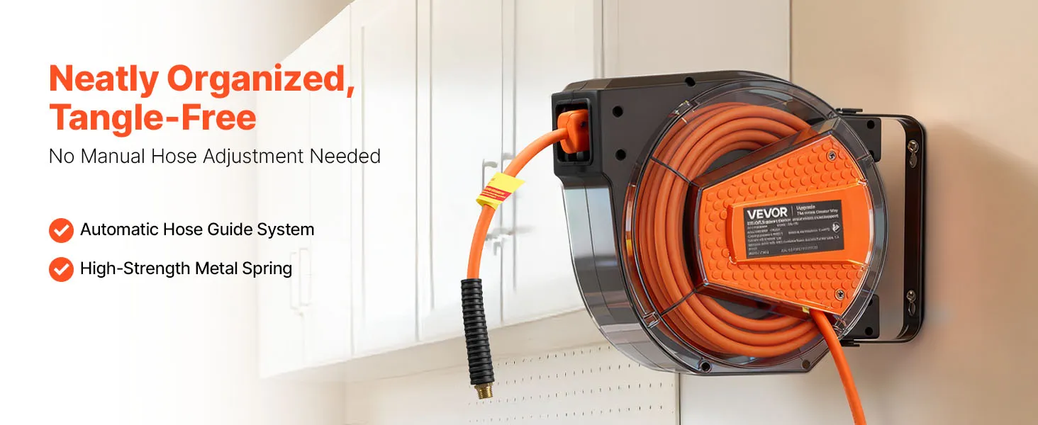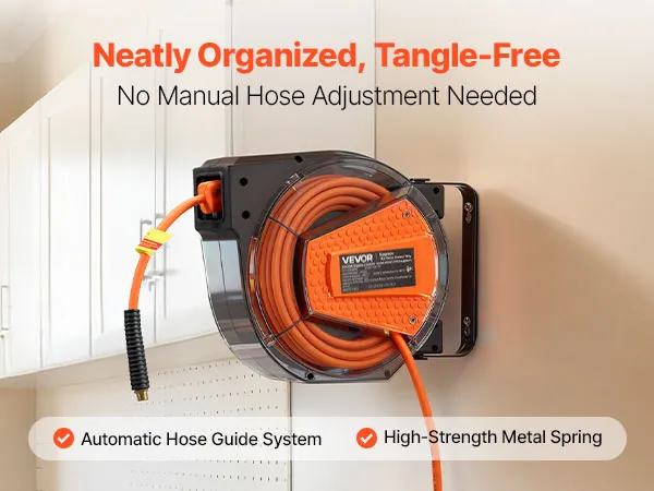 Mangueras enredadas: El carrete retráctil de manguera de aire VEVOR incluye una manguera de aire híbrida de 6,35 mm x 15,24 m y una manguera de entrada de 2 m para mantener su espacio de trabajo ordenado y sin enredos. Olvídese de las mangueras arrastradas por el suelo, lo que reduce el desgaste y el riesgo de tropiezos para un uso más seguro.