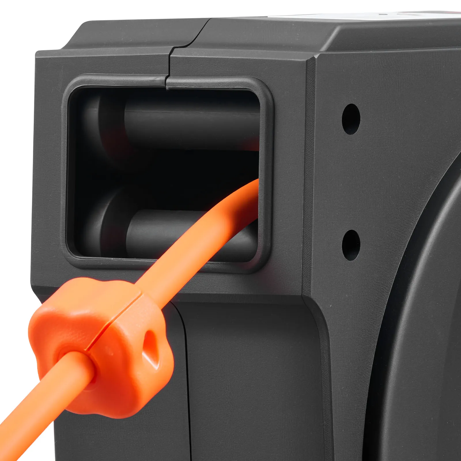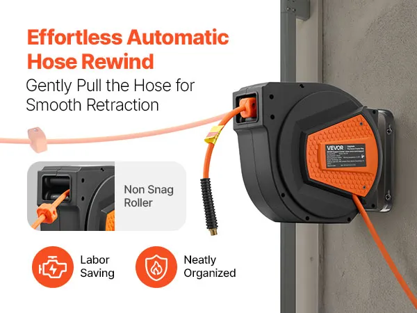 Rebobinado automático: Gestione su manguera fácilmente con el sistema de rebobinado automático: simplemente tire suavemente y se rebobinará suavemente. El tope ajustable y el bloqueo de riel integrado le permiten asegurar la manguera a cualquier longitud, y los rodillos antienganches la guían uniformemente para reducir el desgaste.