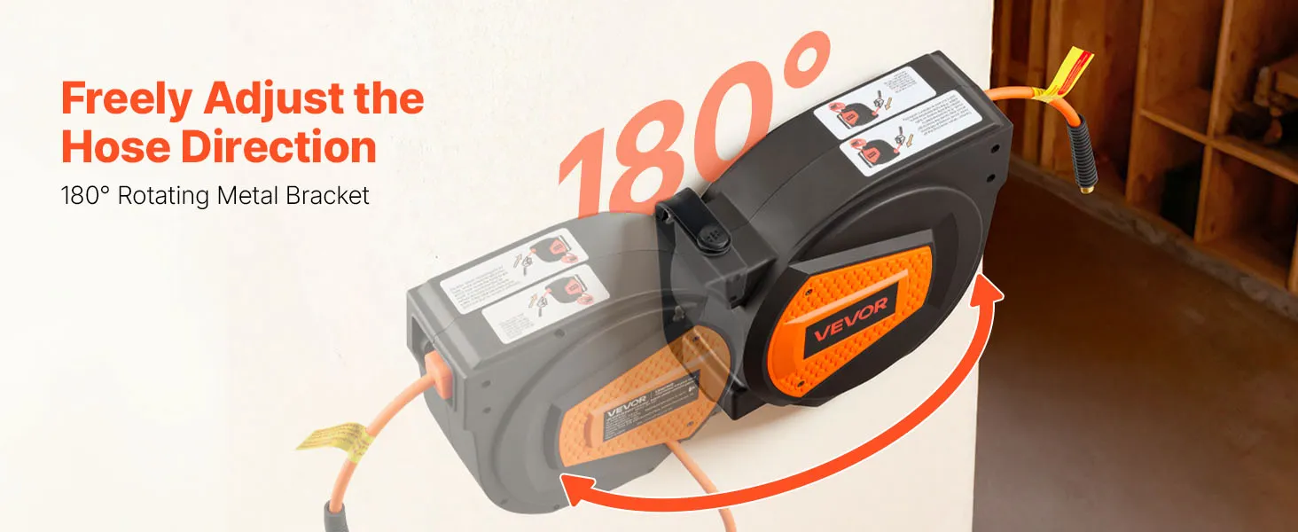 Soporte giratorio de 180°: Nuestro carrete de manguera para compresor de aire incluye un soporte giratorio de 180° preinstalado para un uso más flexible en múltiples direcciones. Se puede montar en techos, paredes o pisos, manteniendo la manguera al alcance y lista para usar sin torceduras.