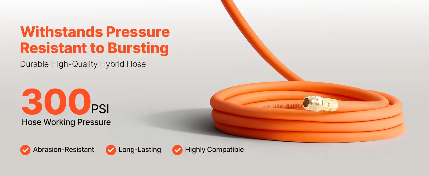 Duradera y flexible: Nuestra manguera de aire híbrida soporta hasta 300 PSI y funciona de forma fiable entre 23 °F y 113 °F, resistiendo torceduras, aplastamientos y roturas para un flujo de aire uniforme. El carrete de plástico incluido es ligero y duradero, ofrece una gran resistencia a los impactos y protege la manguera de daños.