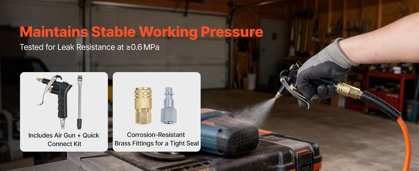 Fácil de conectar y multiusos: Nuestra manguera de aire ha superado pruebas de estanqueidad y se conecta fácilmente a sus herramientas neumáticas y compresores con el conector de latón NPT de 1/4" y el juego de conectores rápidos incluido. También incluye una pistola de aire comprimido, ideal para talleres mecánicos y talleres mecánicos.