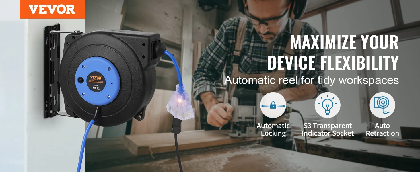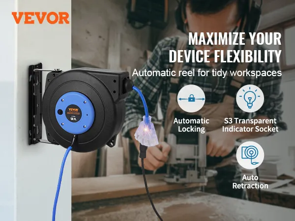 Nuestro carrete de cable de extensión retráctil cuenta con un cable de extensión de 50 pies, un cable de entrada de 4,5 pies, un sistema retráctil automático y un disyuntor de 13 A. ¡Con un cable ignífugo y resistente a enredos 14AWG/3C SJTOW, le brinda la máxima comodidad! ¡Cargue sus dispositivos en cualquier lugar con VEVOR!