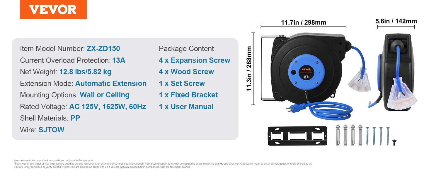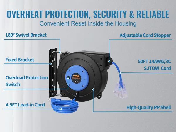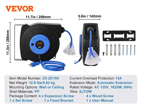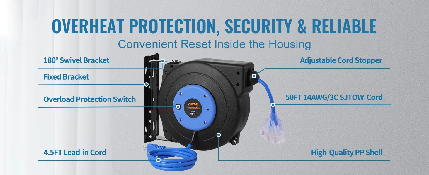 Our retractable extension cord reel features a 50 ft extension cord, a 4.5 ft lead-in cord, an automatic retractable system, and a 13A circuit breaker. Adopting flame-retardant and tangle-resistant 14AWG/3C SJTOW cable, it brings you ultimate convenience! Power up your devices anywhere with VEVOR!