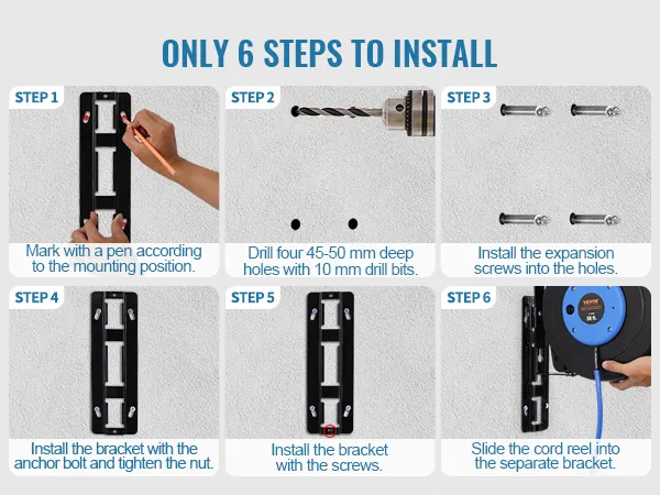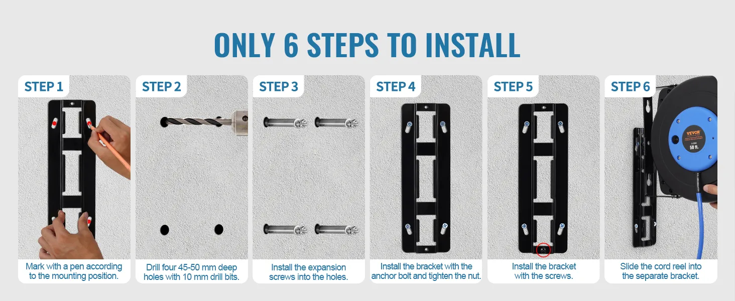 Easily mount our retractable cord reel to your wall or ceiling with the bracket, detailed instructions, and screws. Note: No screws are needed for wall mounting, but they are required for ceiling installation, so make sure to position the screws correctly to avoid the reel falling off.
