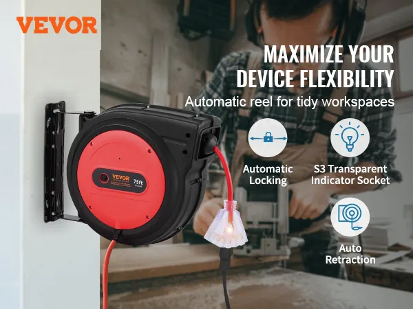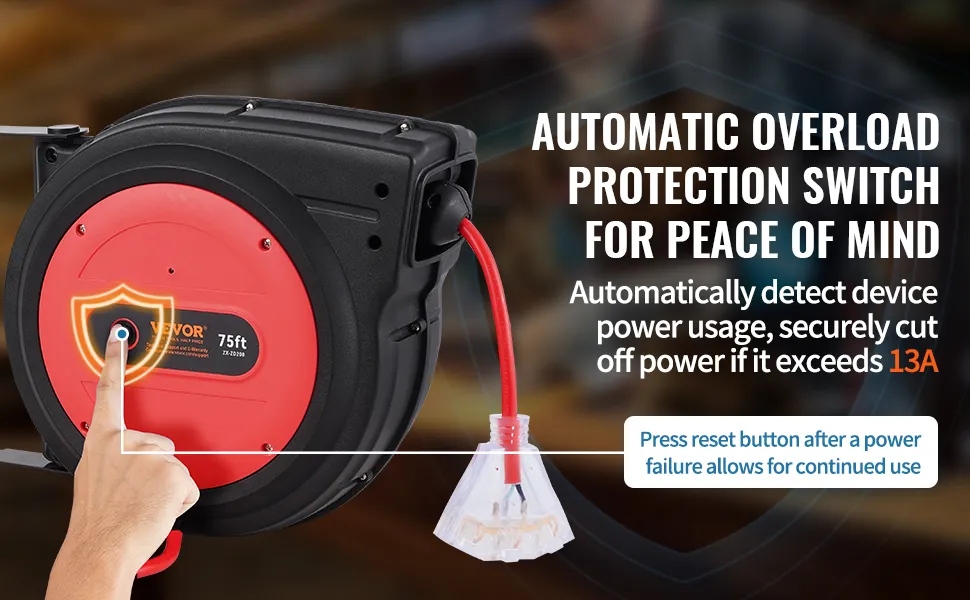 Nuestro carrete de cable de extensión retráctil cuenta con un cable de extensión de 75 pies, un cable de entrada de 4,5 pies, un sistema retráctil automático y un disyuntor de 13 A. ¡Con un cable ignífugo y resistente a enredos 14AWG/3C SJTOW, le brinda la máxima comodidad! ¡Cargue sus dispositivos en cualquier lugar con VEVOR!