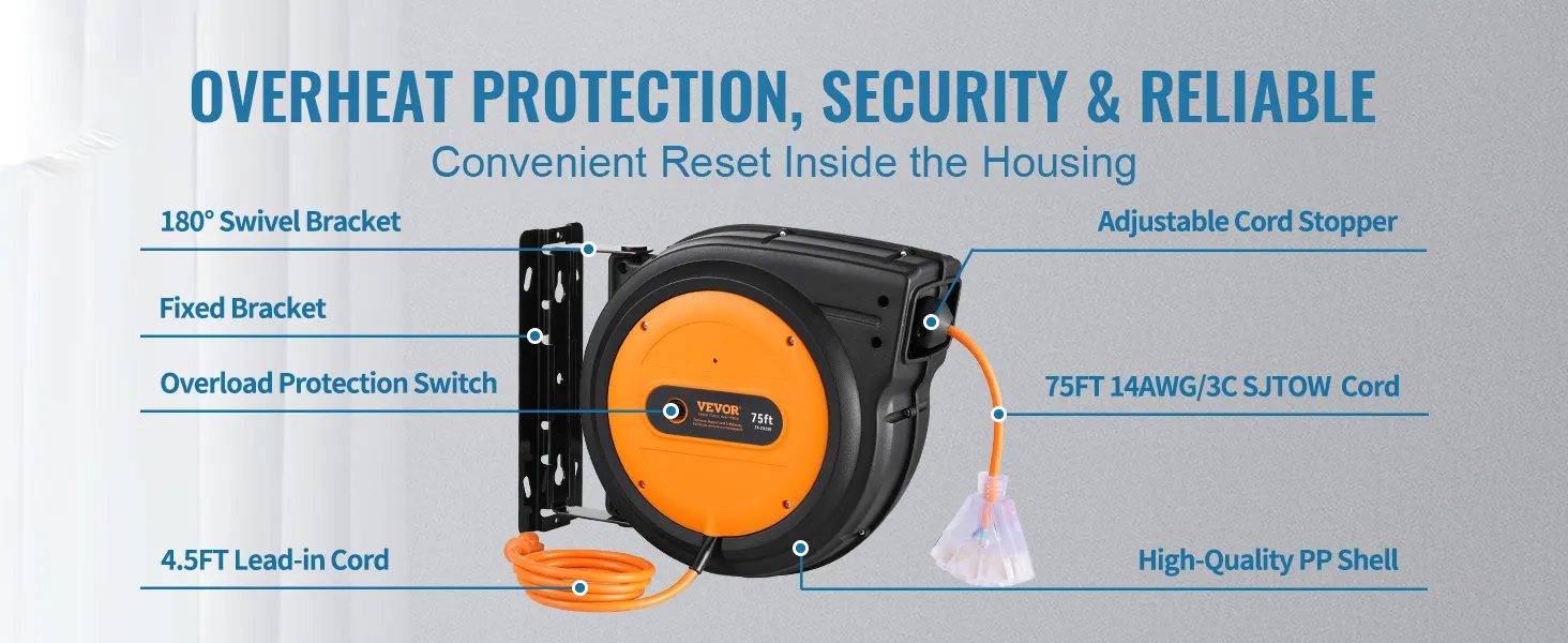 Our retractable extension cord reel features a 75 ft extension cord, a 4.5 ft lead-in cord, an automatic retractable system, and a 13A circuit breaker. Adopting flame-retardant and tangle-resistant 14AWG/3C SJTOW cable, it brings you ultimate convenience! Power up your devices anywhere with VEVOR!