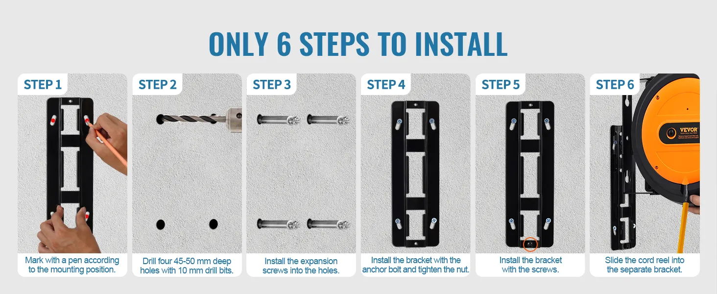 Easily mount our retractable cord reel to your wall or ceiling with the bracket, detailed instructions, and screws. Note: No screws are needed for wall mounting, but they are required for ceiling installation, so make sure to position the screws correctly to avoid the reel falling off.