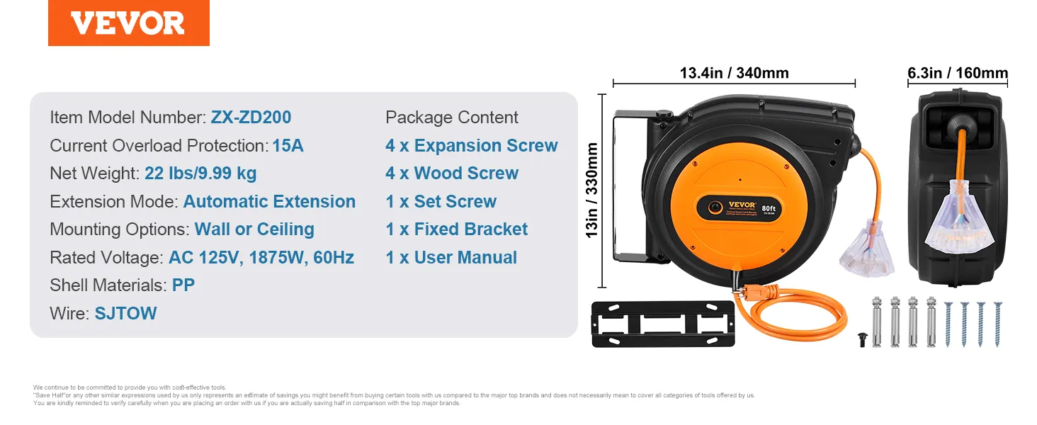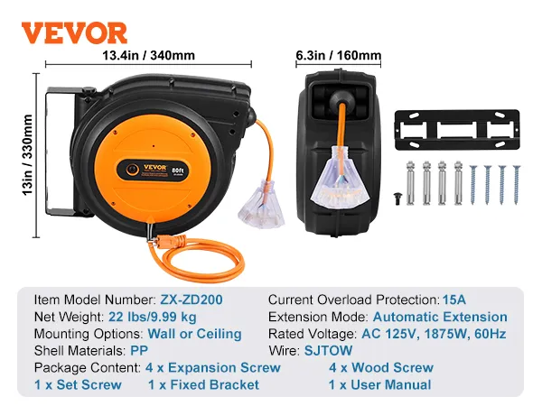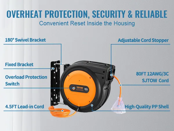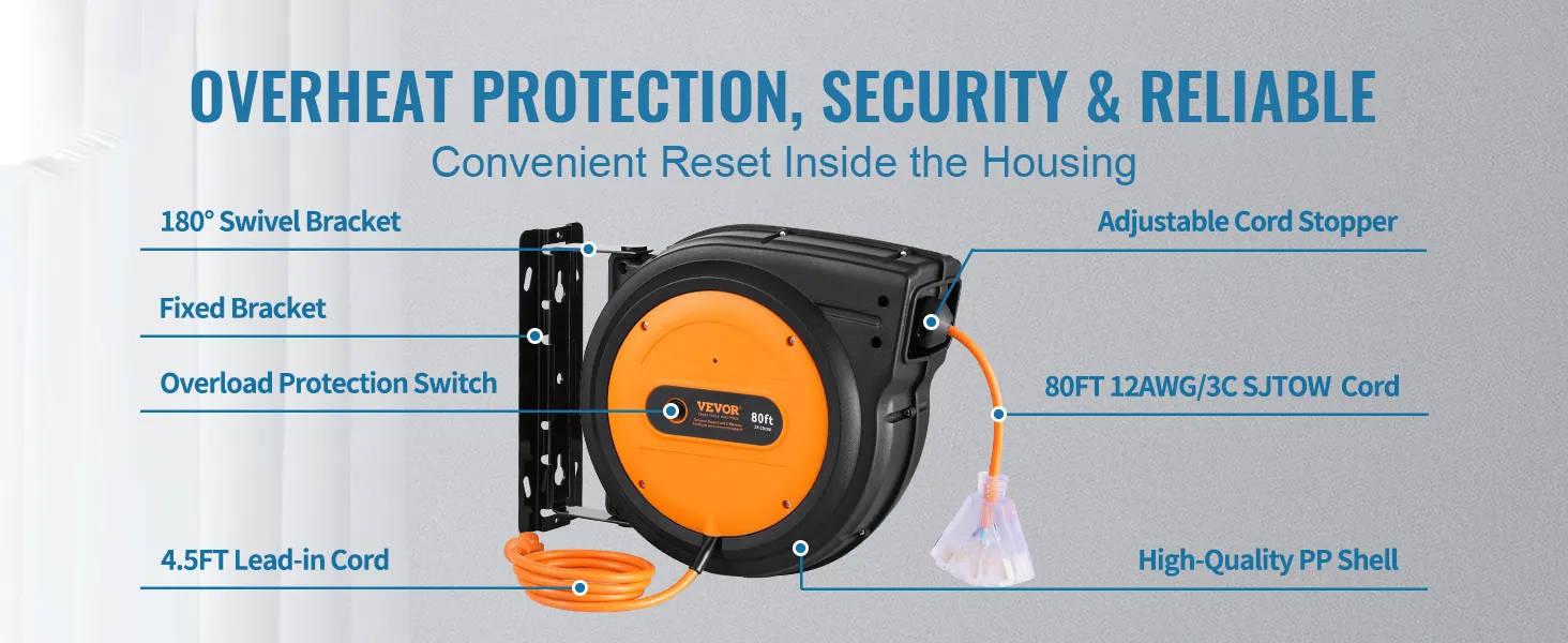 Our retractable extension cord reel features a 80 ft extension cord, a 4.5 ft lead-in cord, an automatic retractable system, and a 15A circuit breaker. Adopting flame-retardant and tangle-resistant 12AWG/3C SJTOW cable, it brings you ultimate convenience! Power up your devices anywhere with VEVOR!
