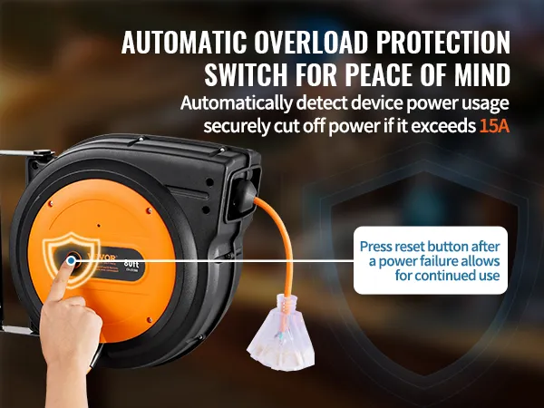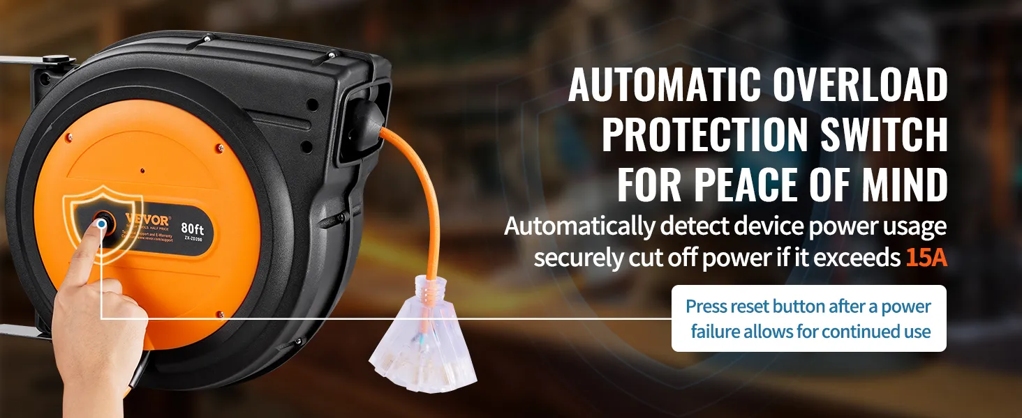 Overload Protection for Peace of Mind: Rigorously tested for electrical security, breaker lifespan, and on/off functionality, our retractable extension cord reel shields your devices from short circuits and overloads. Automatically cuts power if usage exceeds 15A, ensuring secure operation of your power tools. Simply press the reset button to restore power and keep working!