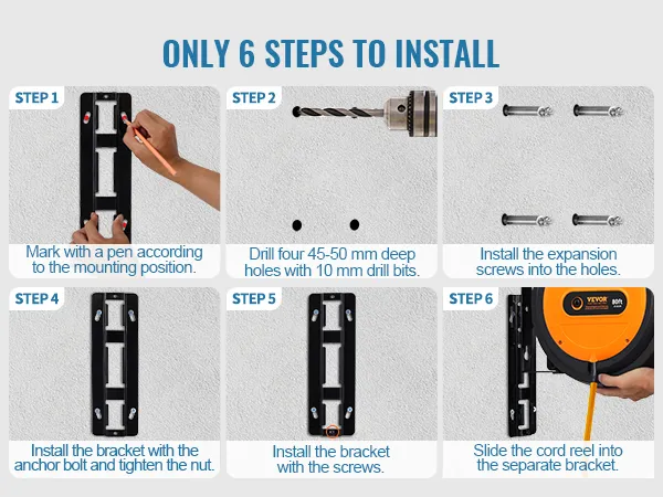 Easily mount our retractable cord reel to your wall or ceiling with the bracket, detailed instructions, and screws. Note: No screws are needed for wall mounting, but they are required for ceiling installation, so make sure to position the screws correctly to avoid the reel falling off.