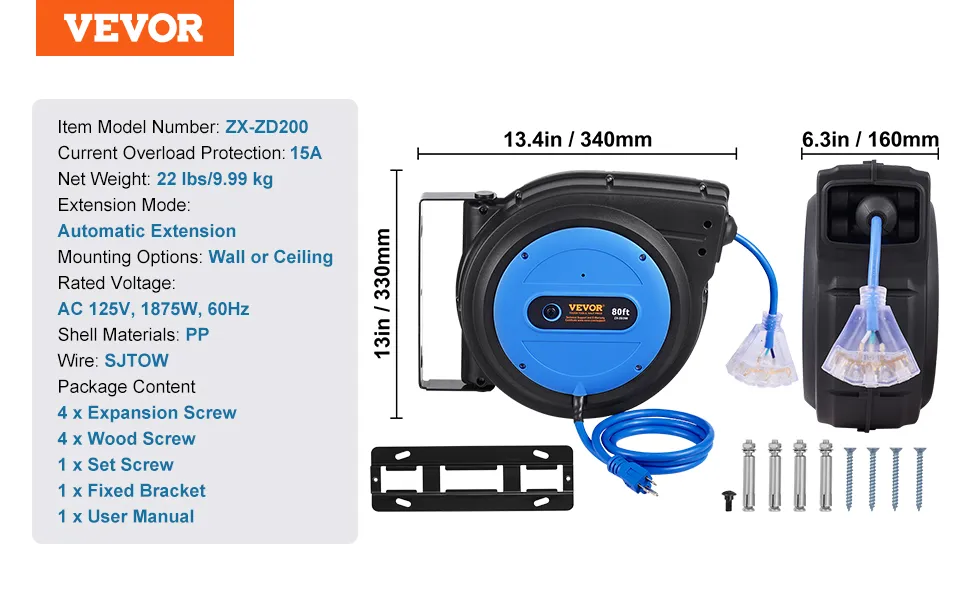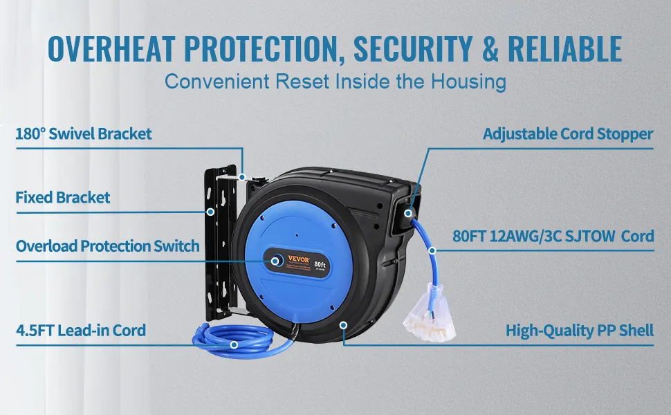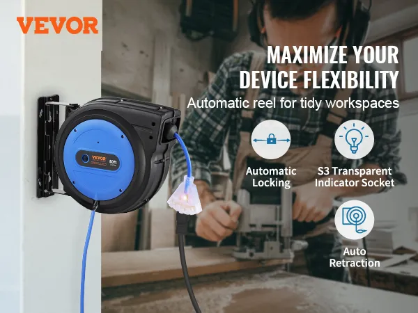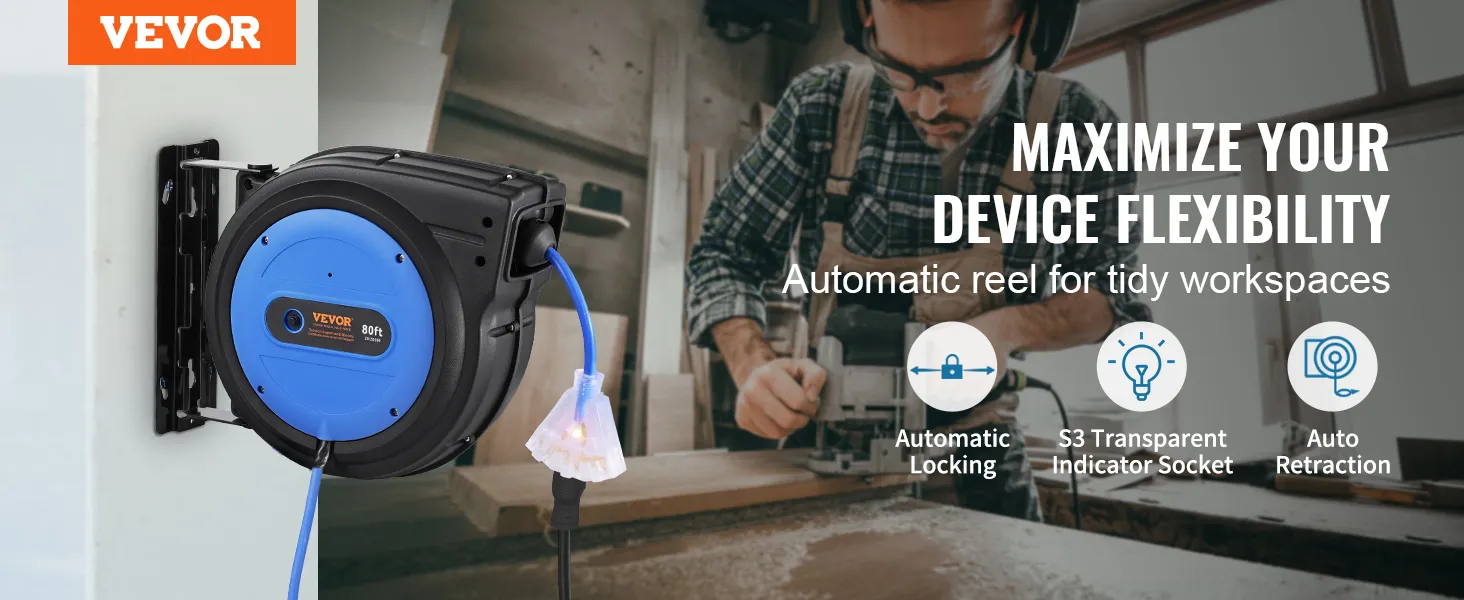 Nuestro carrete de cable de extensión retráctil cuenta con un cable de extensión de 80 pies, un cable de entrada de 4,5 pies, un sistema retráctil automático y un disyuntor de 15 A. ¡Con un cable ignífugo y resistente a enredos 12AWG/3C SJTOW, le brinda la máxima comodidad! ¡Cargue sus dispositivos en cualquier lugar con VEVOR!